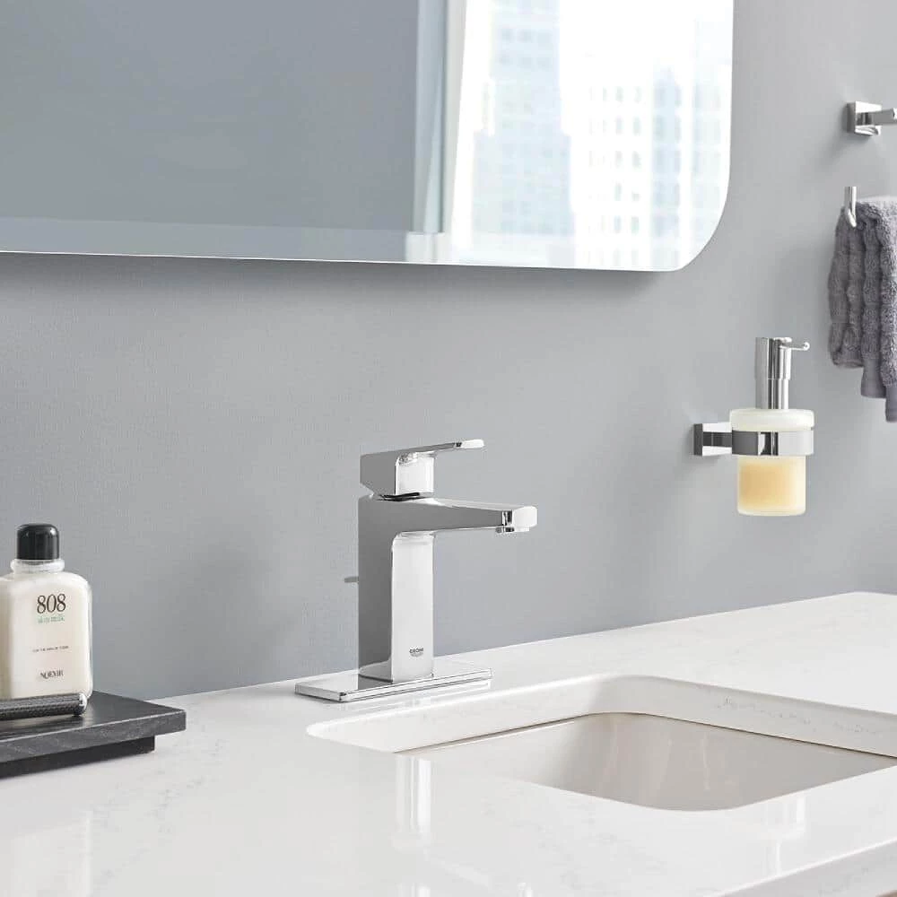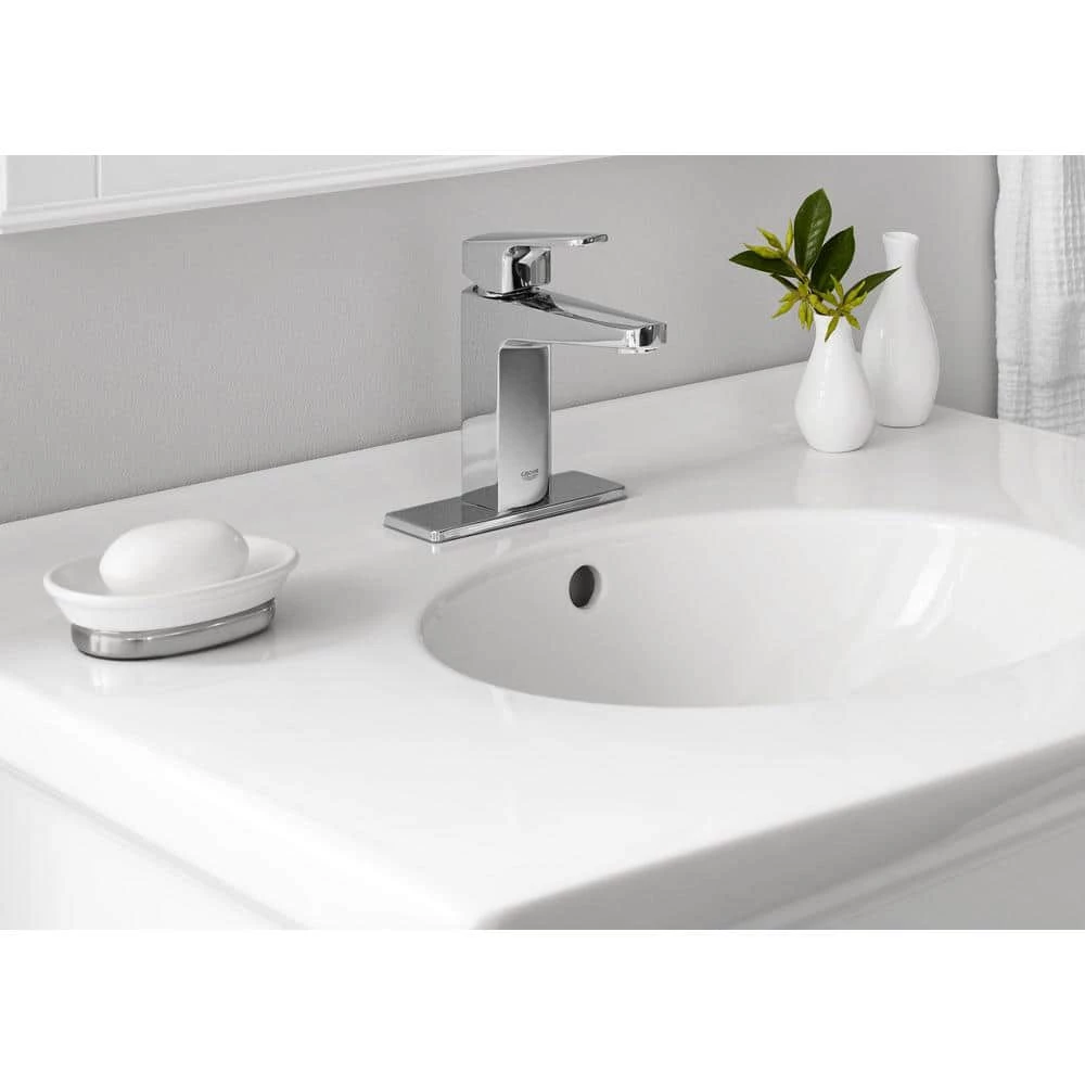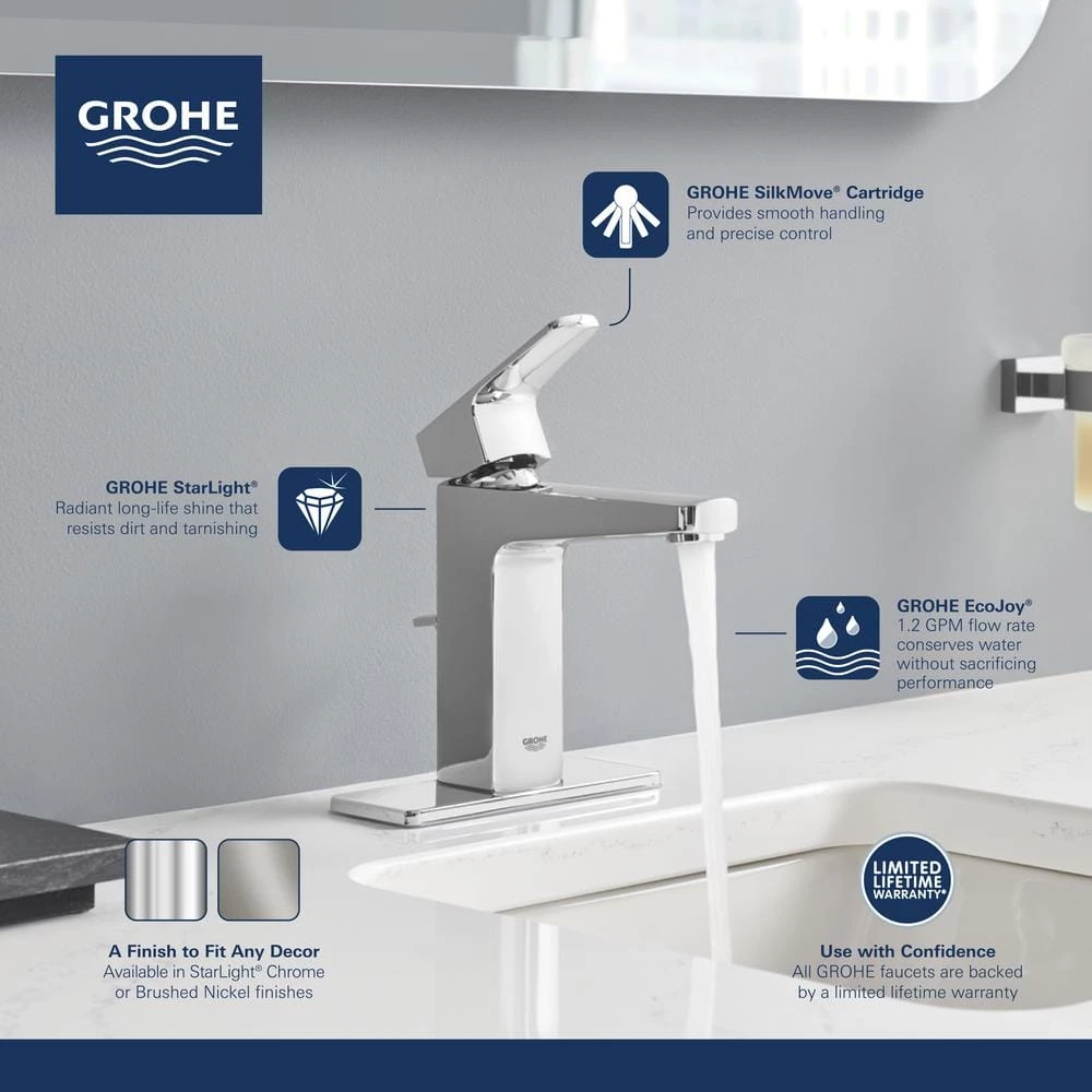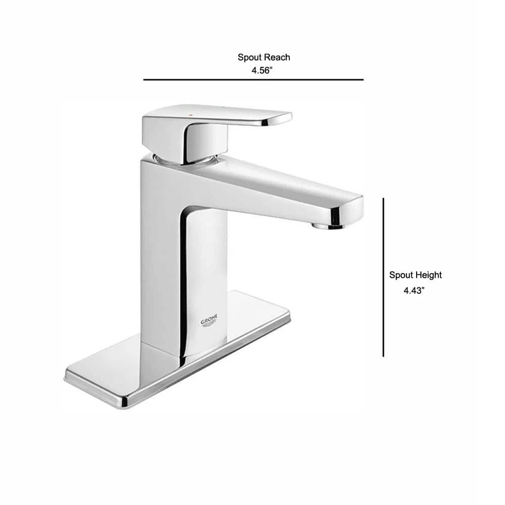 With its bold, angular profile and subtle curves, the GROHE Tallinn 1-Handle 4 Centerset in Chrome commands attention in any bathroom setting. European designed and German engineered, the contemporary-style single-lever mixer incorporates a GROHE SilkMove cartridge for smooth, one-finger control of the water volume and temperature and GROHE EcoJoy technology, which saves water without sacrificing performance. The GROHE Starlight Chrome finish easily resists dirt and scratches, making maintenance effortless and retaining its luster for years to come.