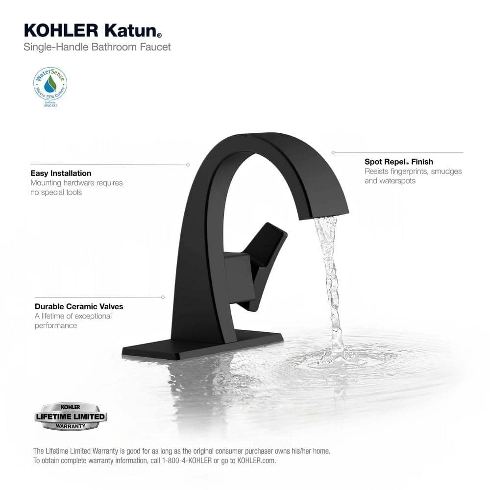 Featuring a unique ribbon water flow, this Katun single-hole faucet adds an element of surprise to your bathroom. Its striking lines and carefully crafted geometry exude timeless sophistication. It includes a clicker drain and supply lines.