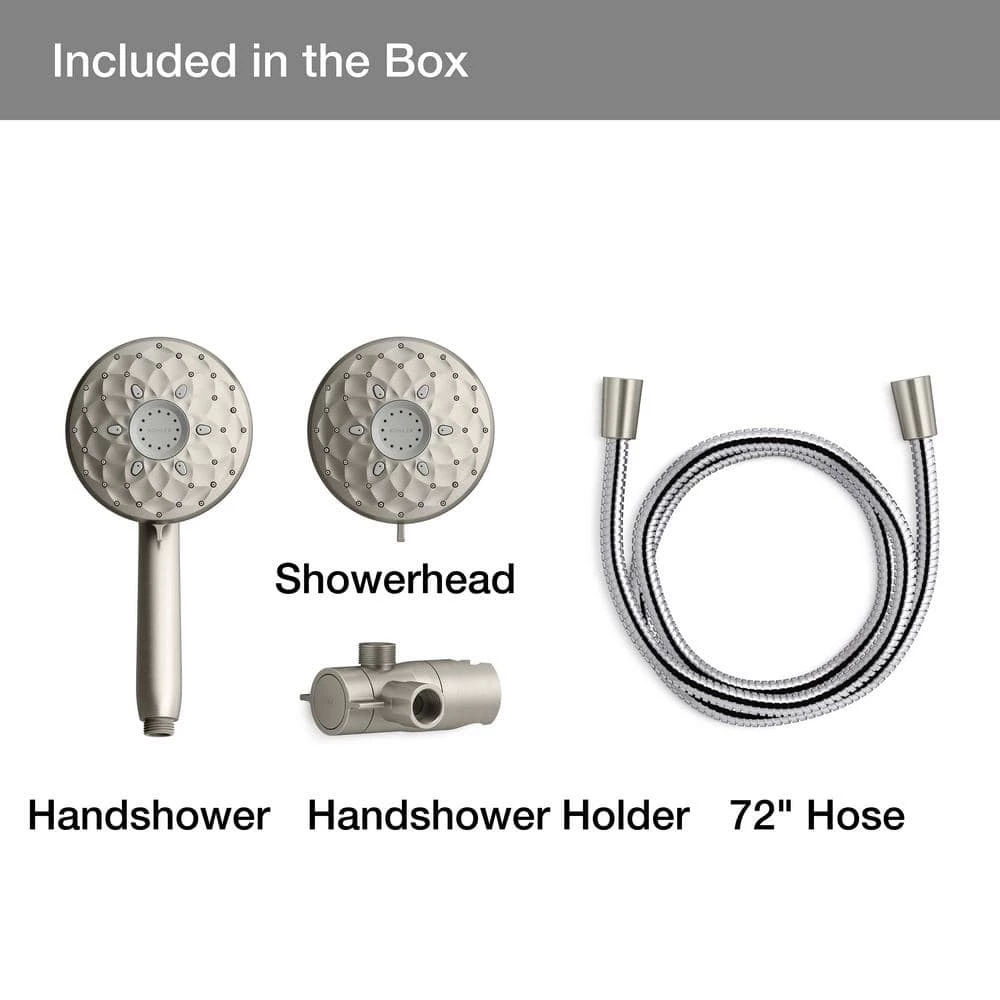 - Box includes: shower head, handheld shower head, diverter/cradle, 72 in. (1829 mm) metal shower hose