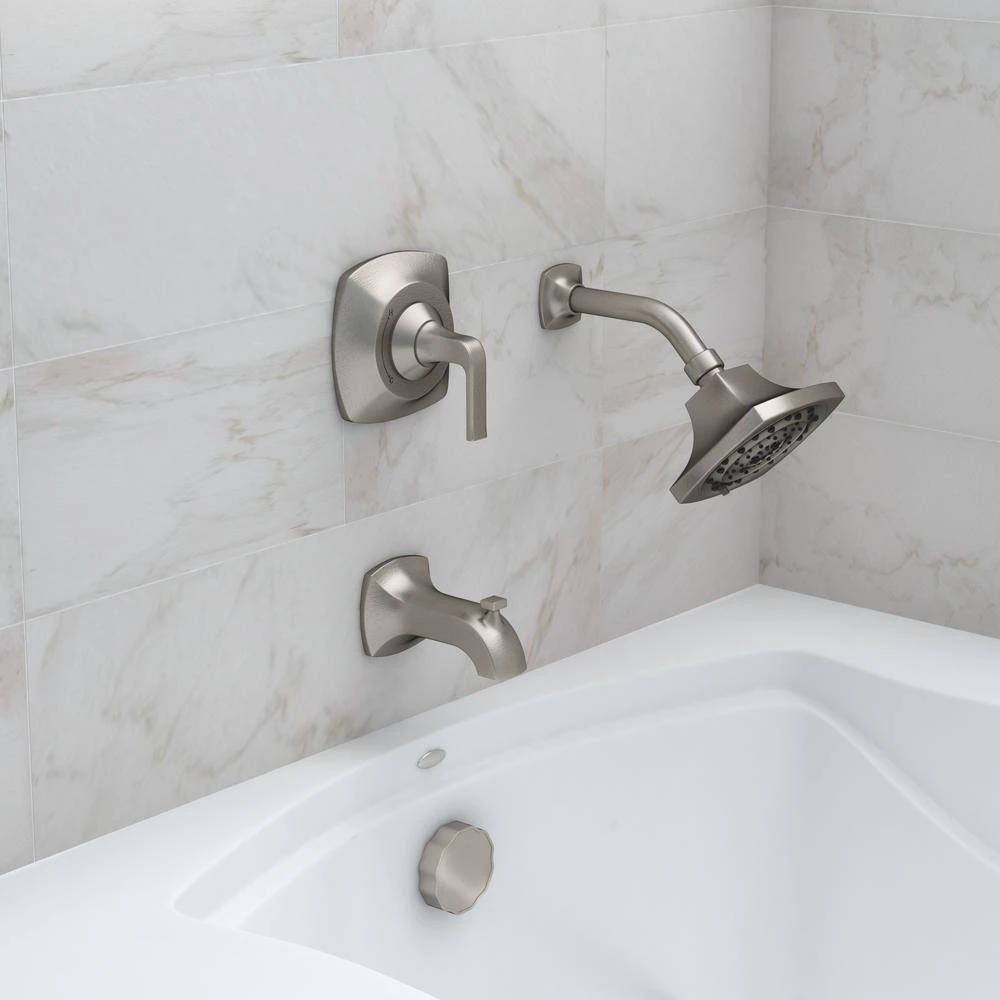Featuring a stylish silhouette, this Rubicon 1-Handle 3-Spray Wall-Mount Tub and Shower Faucet blends clean lines with subtle curves to complement both classic and contemporary decors. Offered in a beautiful brushed nickel finish, Rubicon’s streamlined look is easy to clean and its finish resists corrosion and wear. The bath and shower trim includes a showerhead, scroll lever handle and spout. This trim features KOHLER’s Rite-Temp pressure-balancing valve which maintains your desired water temperature during pressure fluctuations.