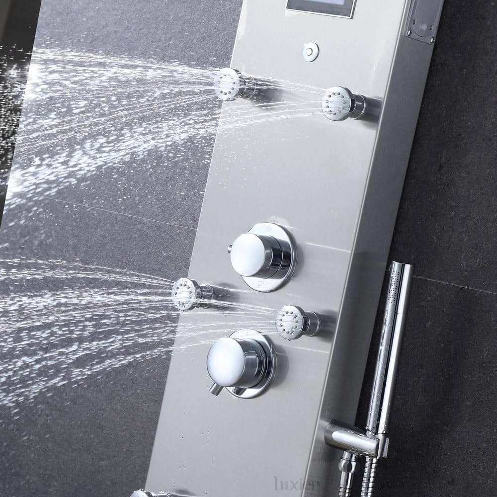 Introducing the SP34 shower panel, a luxury stainless steel shower panel with 8.5 in. rainfall shower head, 6 in. circular adjustable angle massage jets, tub spout and hand shower. Equipped with pressure-balance valve to minimize the chance of scald. Brought to you by luxier, the premium brand in European designed bathroom and kitchen hardwares. All luxier shower panels are backed by 2-years manufacturer warranty and customer support.