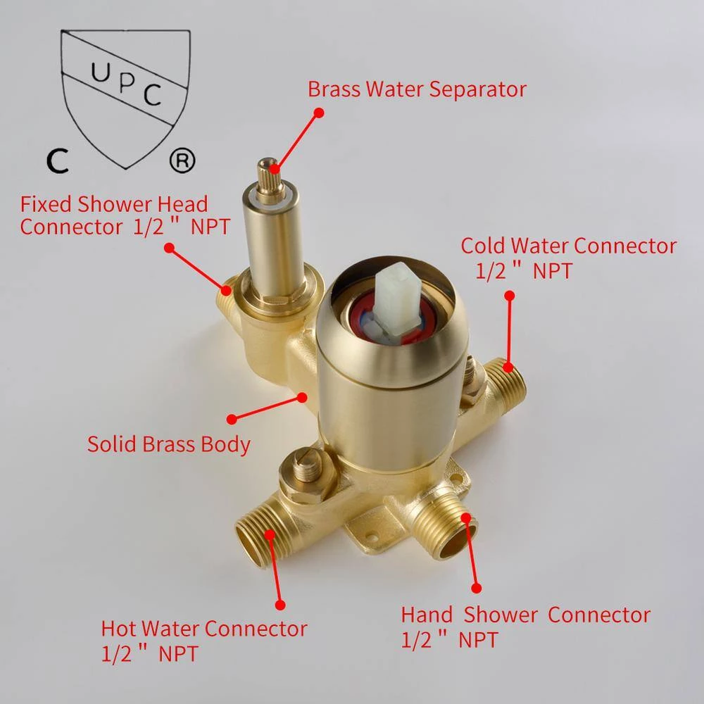 - 12 inches square rain shower head (Brass), handheld shower head (Brass), 15.7 inches shower arm (Brass), 1.5M shower hose (SUS304 Stainless steel), shower holder(Brass), shower mixer valve body (Brass) and other necessary installation parts