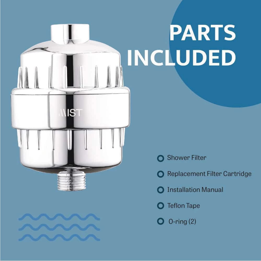 - Package contents includes: Manual, Shower Filter, Replacement Filter Cartridge, Tape, O-Ring (2). Flow Rate: 2.5 GPM, Filter Life: 12,000 Gallons or 6 Months, Operating Temperature: 40-175ËšF, Operating Pressure: 20-100 psi. Filter Dimensions: Diameter 3.25″, Length 5″ , Entry and Exit Valve: 1/2″ thread