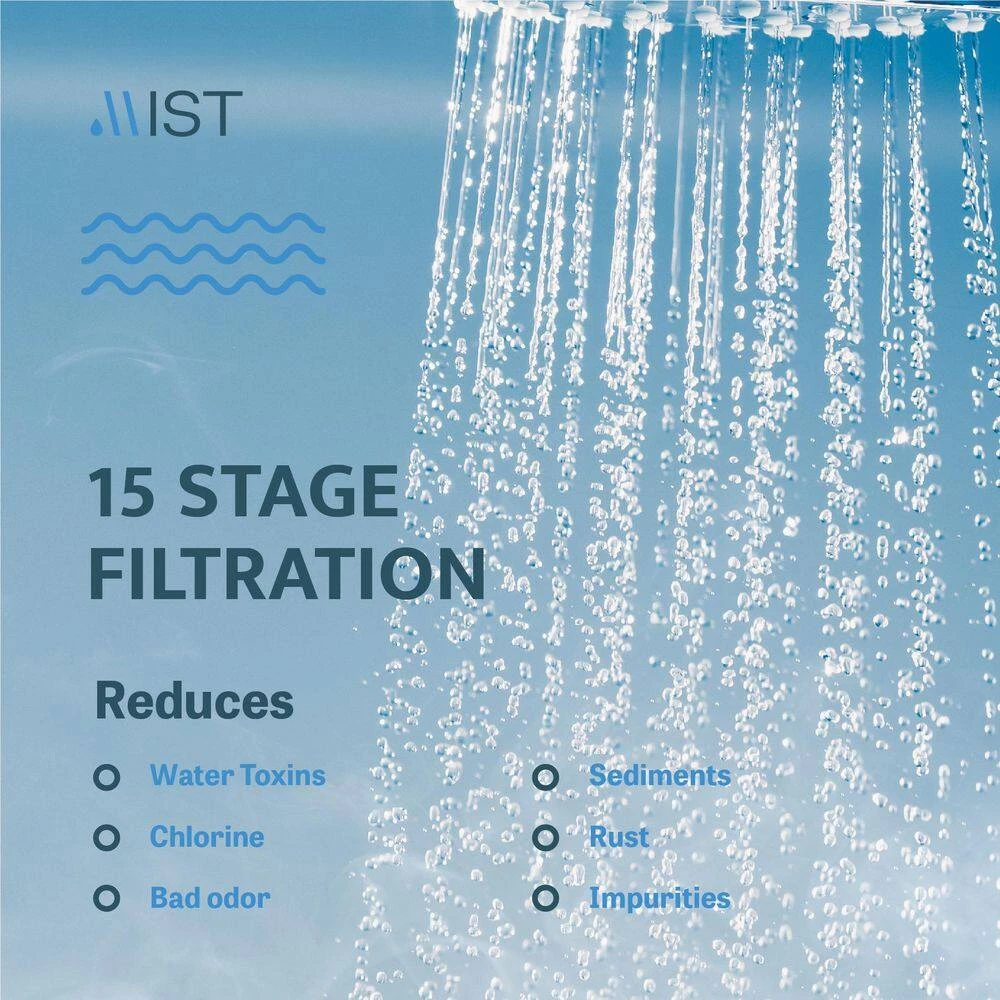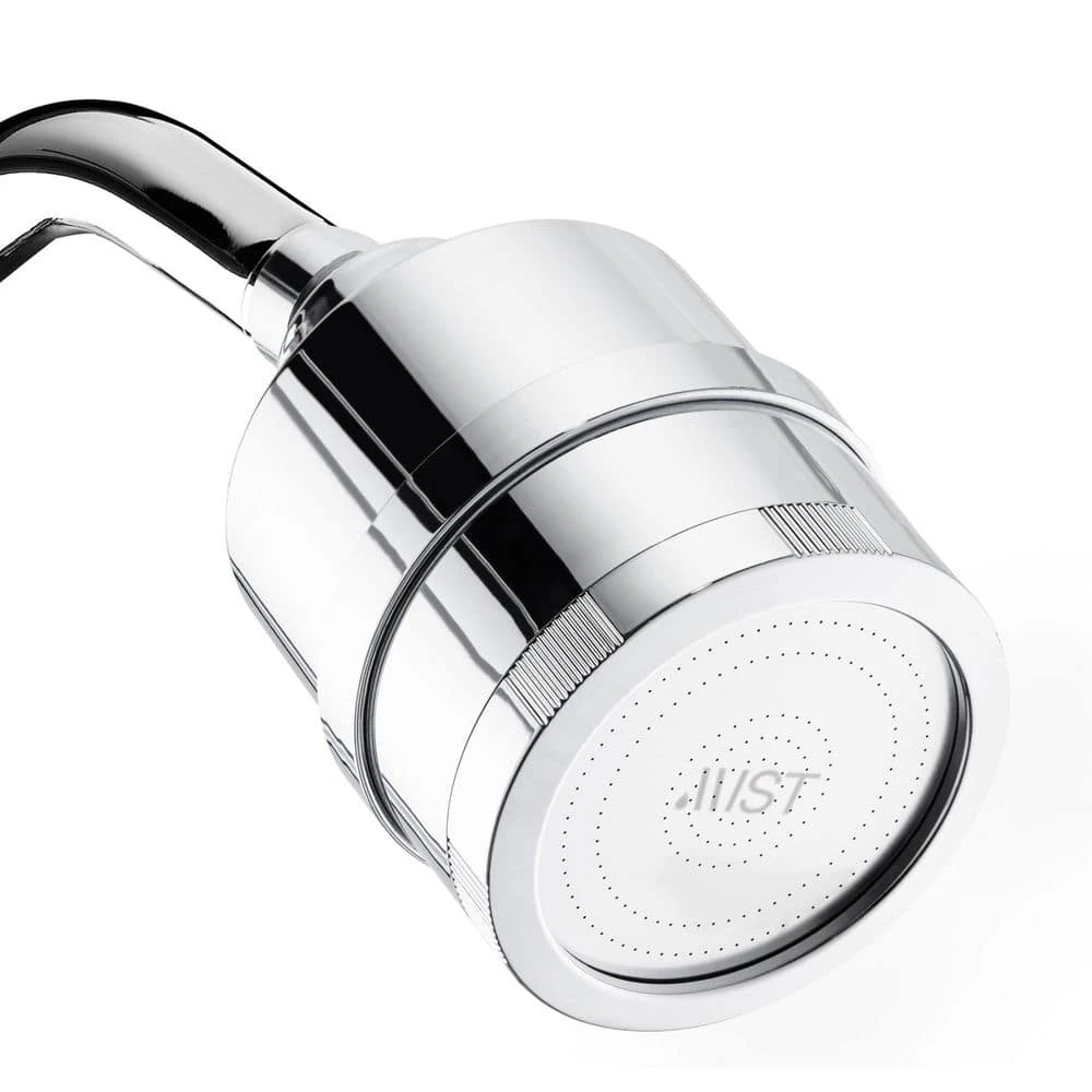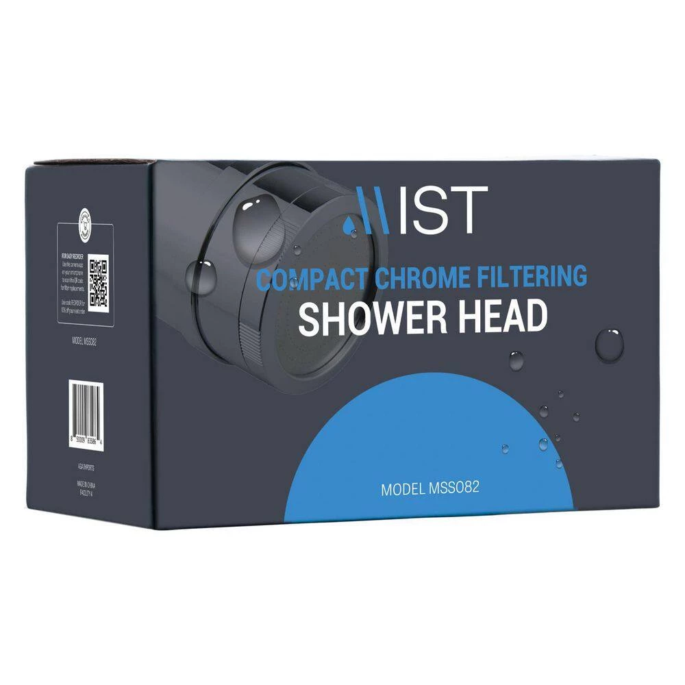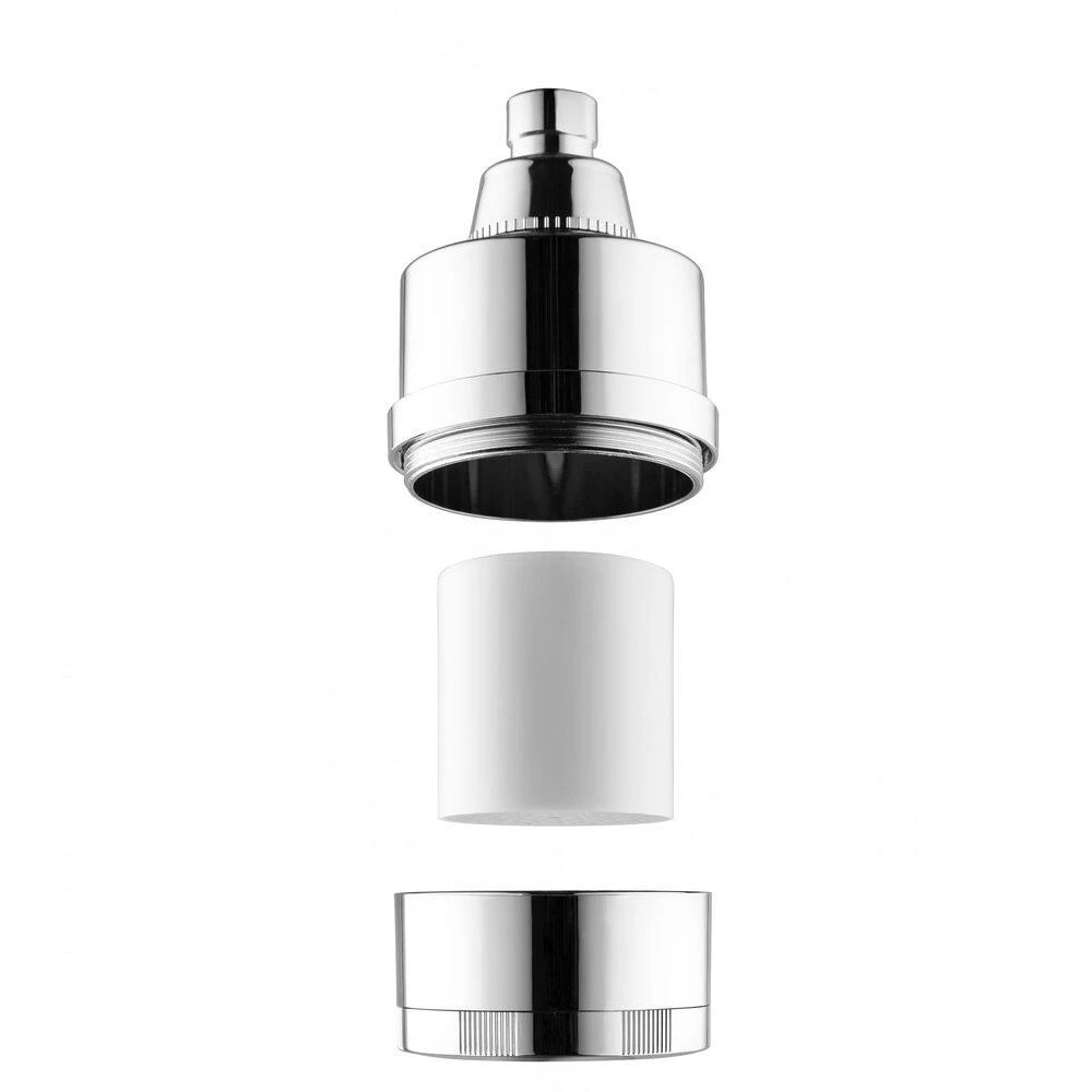 Mist water softening chrome shower head, with a replaceable high-quality filter designed to eliminate contaminants such as sediment, rust, and many microscopic particles with a 15 stage filtration system. Effectively removes chlorine and bad odor-causing bacteria from water. Delays skin aging by removing water toxins and helps boost the immune system by preventing chlorine-induced skin damage and enhancing skin vitamin supply. Dramatically improves the appearance of hair and nails by maintaining skin pH balance and cellular health. Quick and easy installation process. Package contents include Mist filtering showerhead, filter cartridge, Teflon tape, manual, and O-ring (2). Filter life of 12,000 gallons or replace filter after six months (sold separately), a flow rate of 2.5 GPM. Filter dimensions; diameter 3 inches, length 5.25-inch entry and exit valve; 1/2 inch thread.