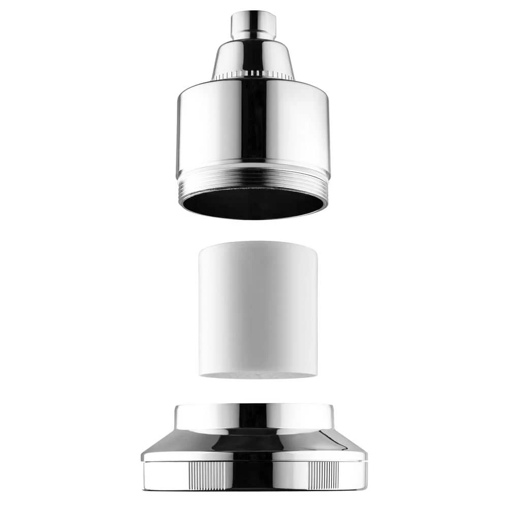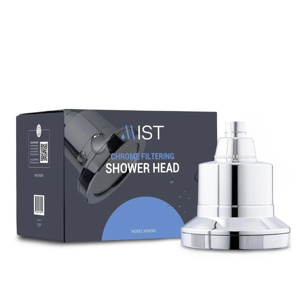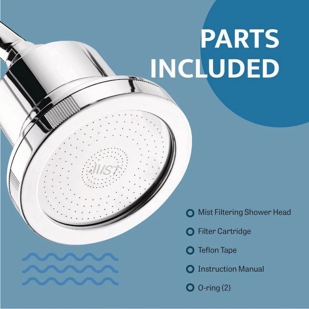 Mist Water Softening Chrome Shower Head, with a replaceable high-quality filter designed to eliminate contaminants such as sediment, rust, and many microscopic particles. Effectively removes chlorine and bad odor-causing bacteria from water. Delays skin aging by removing water toxins and helps boost the immune system by preventing chlorine-induced skin damage and enhancing skin vitamin supply. Dramatically improves the appearance of hair and nails by maintaining skin pH balance and cellular health. Quick and easy installation process. Package contents include Shower Filter, Teflon tape, Manual, and O-ring (2). Filter life of 12,000 gallons or replace filter after six months (sold separately), a Flow rate of 2.5 GPM. Filter Dimensions: Diameter 4.5", Length 5.75" Entry and Exit Valve: 1/2" thread.