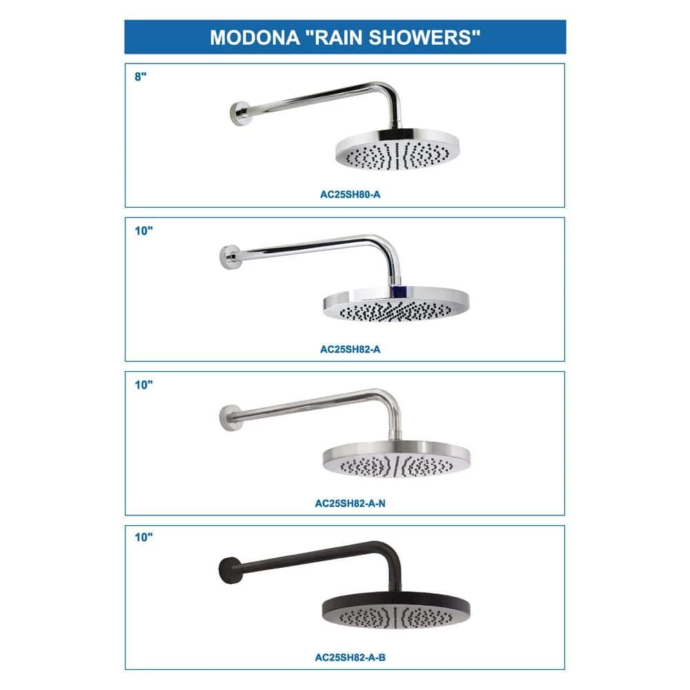 MODONAS 10 Rain Shower Head and 15 in. Long Shower Arm with Flange will help you transform your bathroom into the bathroom of your dreams and transform your boring shower chore into a relaxing rain shower experience. The shower arm and flange are made of Solid BRASS and will last much longer than stainless steel or zinc. Fittings are reinforced NPT (Tapered) for a perfect, water-tight fit. The 10 in. rain shower head is made of chrome plated ABS, rated at 2.5 GPM with a removable water saver. The rubber nubbins (spray outlet holes) are made of high-grade soft rubber, that will allow you to easily wipe away calcium and lime build-up. Easy to install, simply unscrew the old shower arm, apply included plumbers tape and screw in the new shower arm, then screw on the shower head and you are finished, no special tools or experience needed. This unit is available in polished chrome, satin nickel, and rubbed bronze. All of MODONA products are covered by our Comprehensive 5 Year Warrantee.