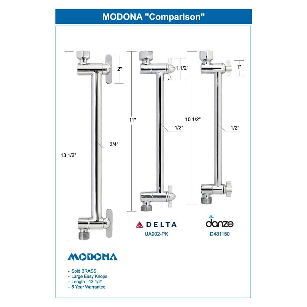 - BIGGER AND BETTER: Modonas Adjustable Shower Arm is 13 in length and has a diameter of as opposed to other brands that are only 10 or 11 and have only diameter tube; this will allow increased water flow and a better shower experience. The Adjustment Knobs are EXTRA large and easy to use.