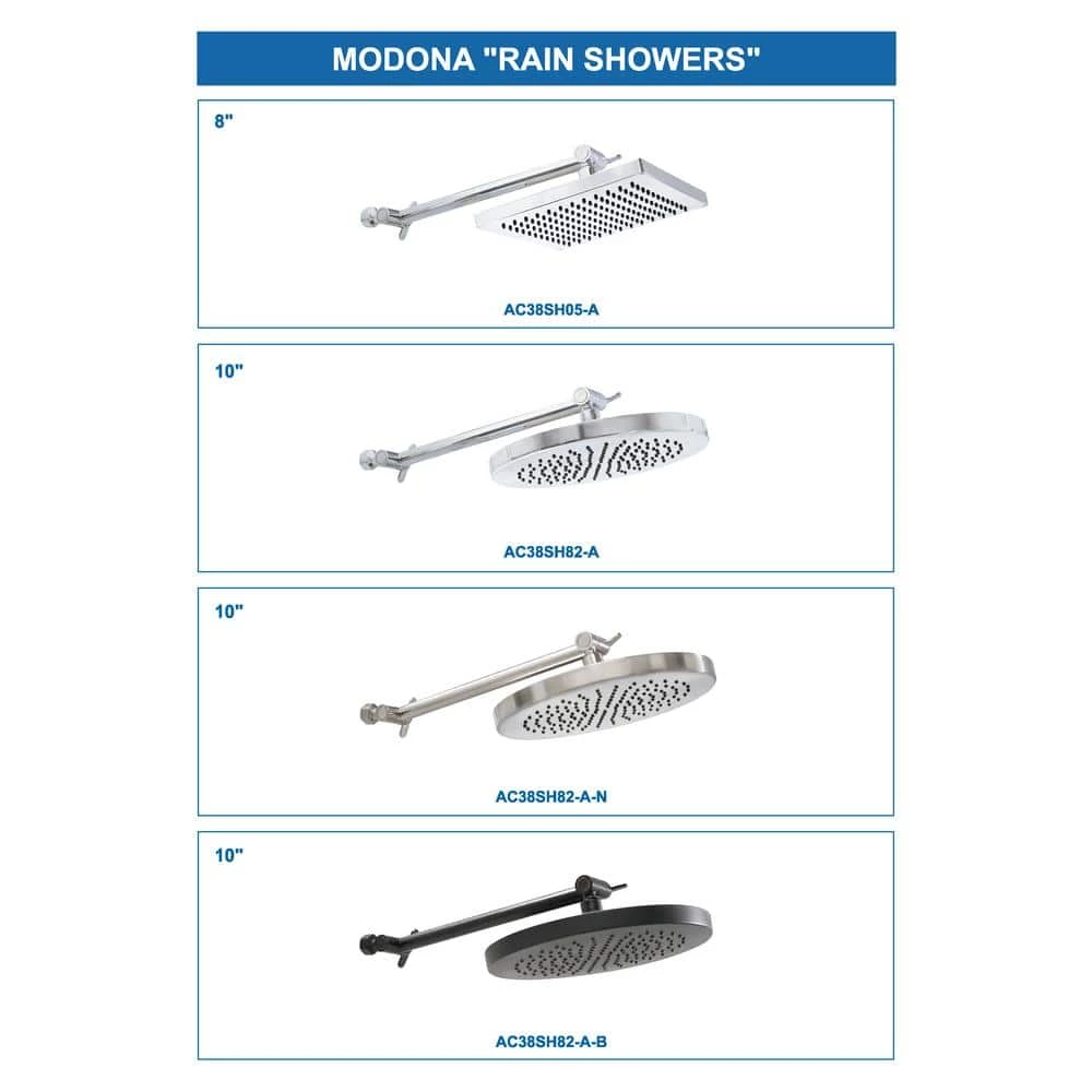 - BEAUTIFUL: Clean and Modern Design. Available in Polished Chrome, Satin Nickel and Rubbed Bronze. Please use with any MODONA Rain Shower Heads for a Perfect Match.