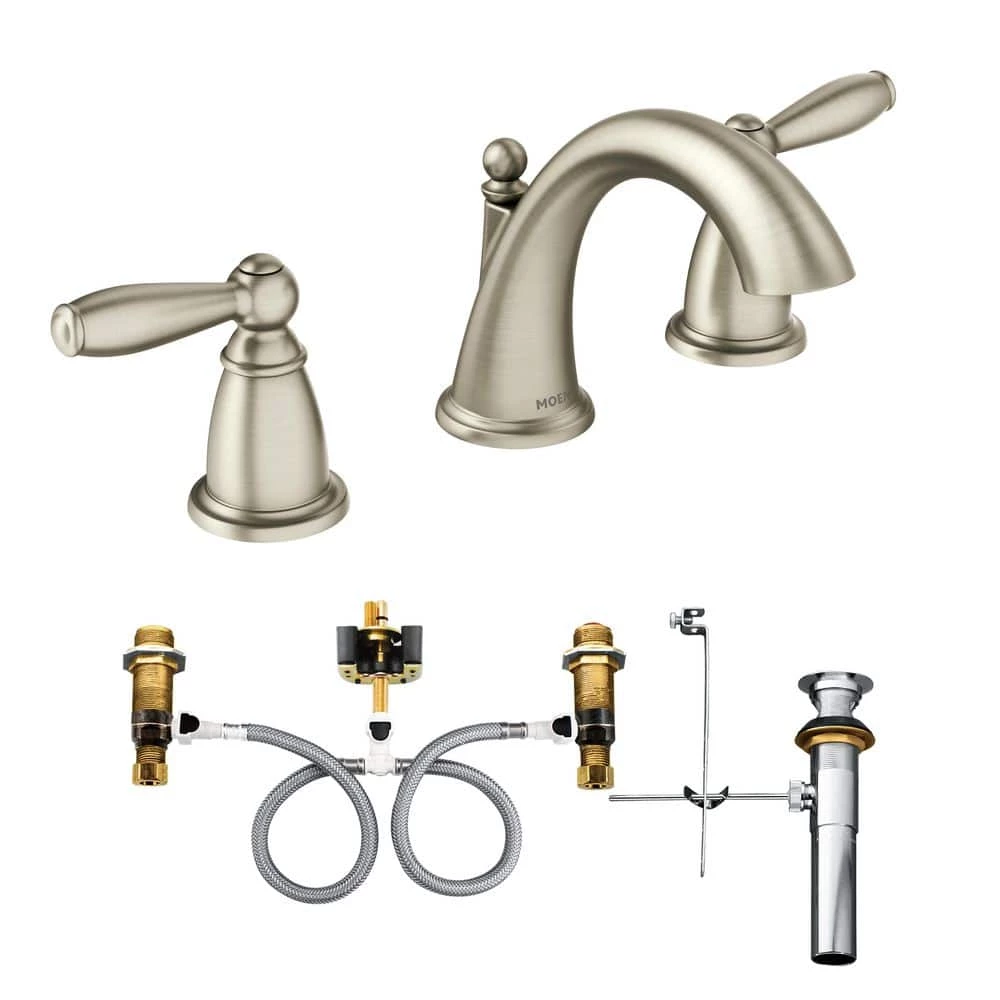 Featuring intricate architectural details that add a look of grandeur to your bathroom, the MOEN Brantford 8 in. Widespread 2-Handle High-Arc Bathroom Faucet Trim Kit with Valve will offer a timeless, elegant appeal. Boasting a brushed nickel finish that brings the warm look of stainless steel to your bathroom, this faucet features a classic lever handle, tapered spout and globe finial for versatility. With each understated detail, this trim kit is sure to create an enduring style in your space.