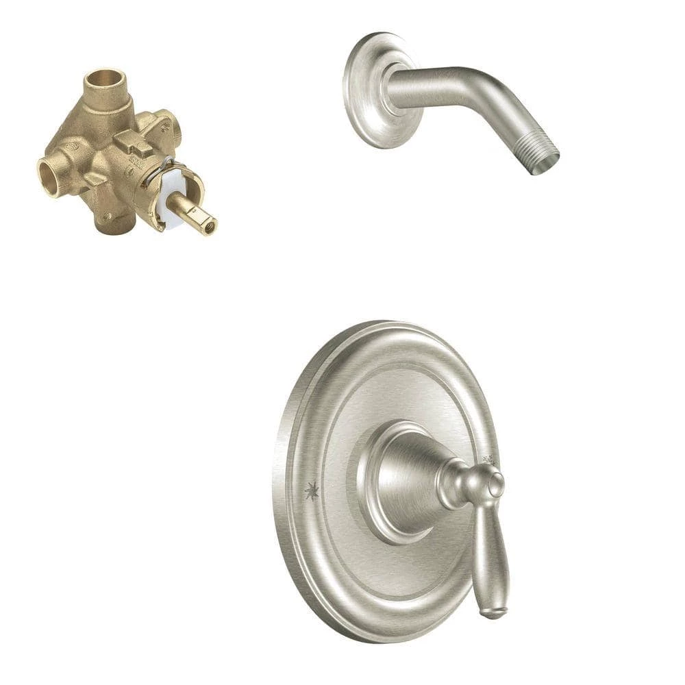 The Brantford Single-Handle Shower Faucet Trim Kit from MOEN offers chic sophistication and temperature-stable water flow so your bathroom excels in form and function. A single-handle lever rotates 270 degrees to adjust water temperature, held steady by the included PosiTemp valve to keep flow at your preferred heat intensity. The underlying metal construction makes it strong and durable while the LifeShine protectant prevents flaking, corroding and tarnishing for lasting performance and prolonged pristineness. Part of the M-PACT common valve system, this package makes it easy to substitute the trim without tweaking the plumbing should your future style preference change. The lustrous brushed nickel finish offers subtle shimmer that will contemporize and glamorize your powder room. A showerhead is not included in this trim set and must be purchased separately.