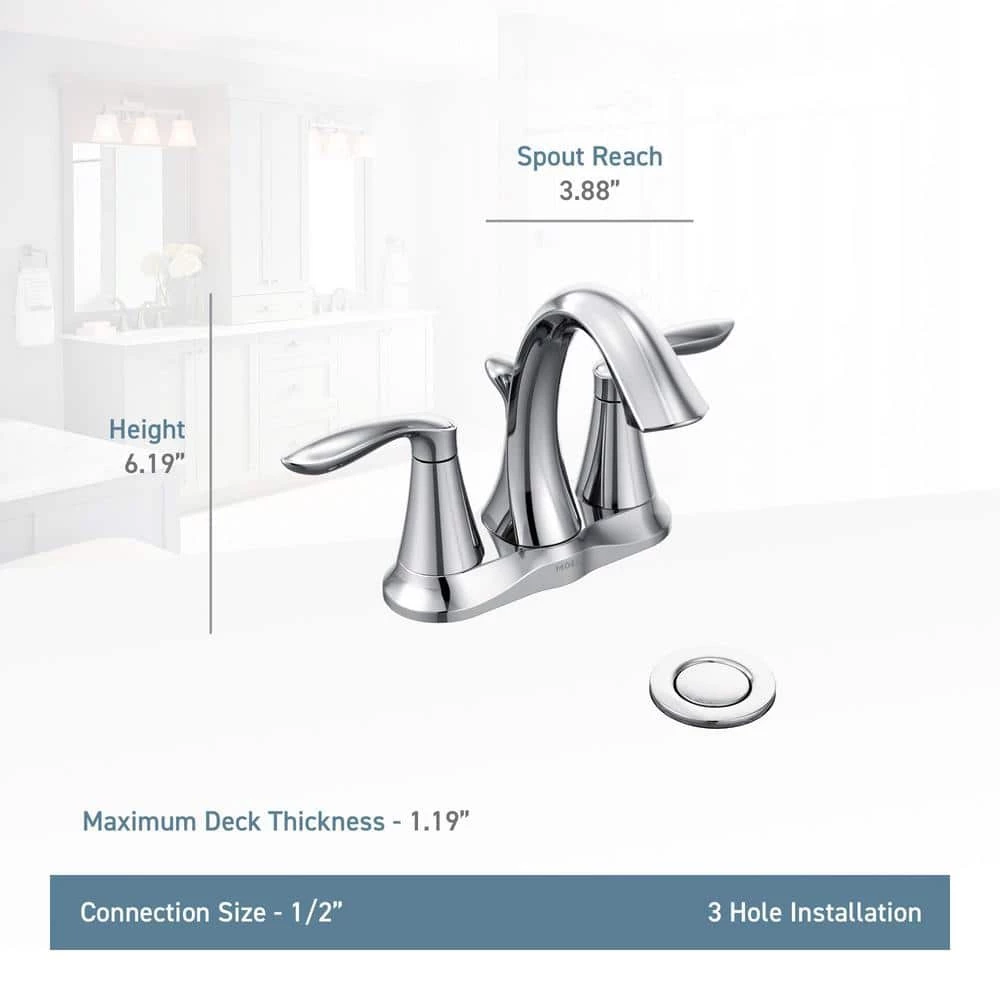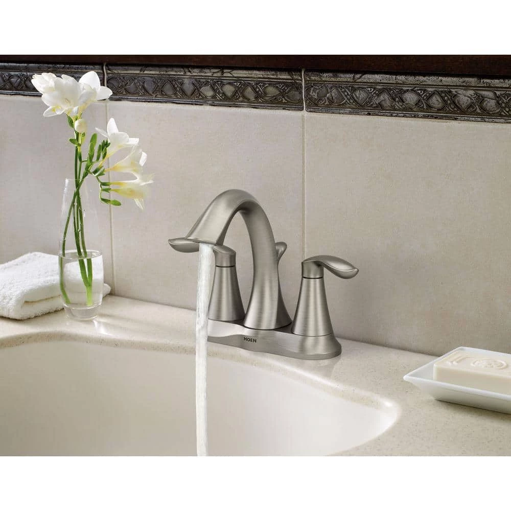 Incorporating a graceful design and clean lines that coordinate beautifully with a wide variety of decor styles, the Eva 2-Handle High-Arc Bathroom Faucet from MOEN features flowing curves with elegant, petal-style handles. Its pure and organic aesthetic is paired with smooth functionality, durable metal construction and a smooth, brushed nickel finish, while the dual lever handles enable precise control over temperature and flow. This model is also WaterSense-certified for eco-friendly operation, ensuring efficient water usage with the performance you expect.