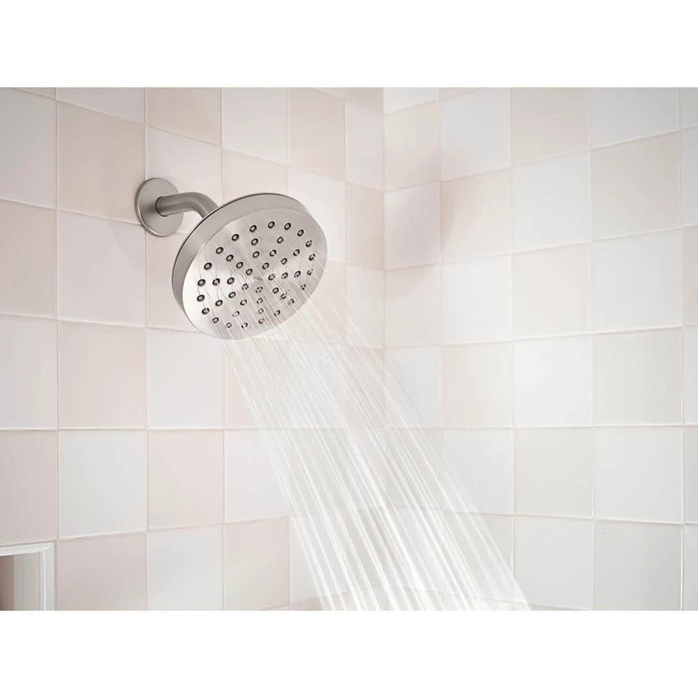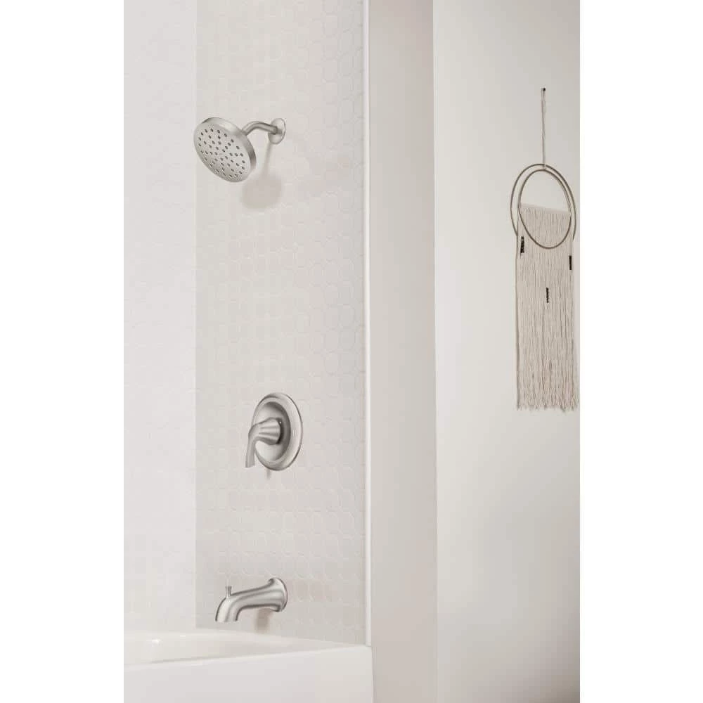 The Korek 1-Handle Tub and Shower Faucet from MOEN sets the standard for exceptional beauty and reliable, innovative design. With a rainshower showerhead. Featuring a smooth, Spot Resist finish in brushed nickel, the faucet lets you easily maintain a brilliant finish by preventing the unsightly buildup of fingerprints and water spots-and when it does come time to clean, the finish wipes clean in seconds. This environmentally friendly design is also WaterSense certified to reduce water waste, making it an efficient and responsible choice for your home.