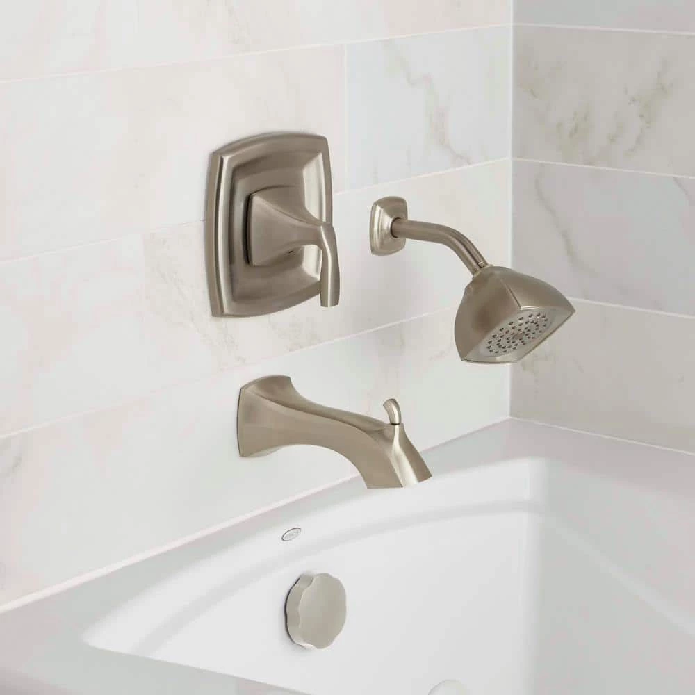 Crisp edges and uncomplicated style features give the Voss collection an ageless, yet fashion-forward, presence. Each silhouette brings a confident transitional style to the bath. This brushed nickel Posi-Temp tub/shower was built to last by MOEN. Designed for use in your bath.
