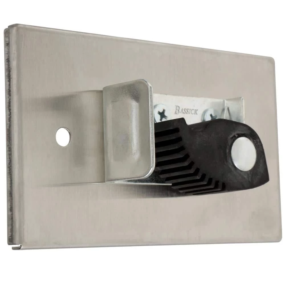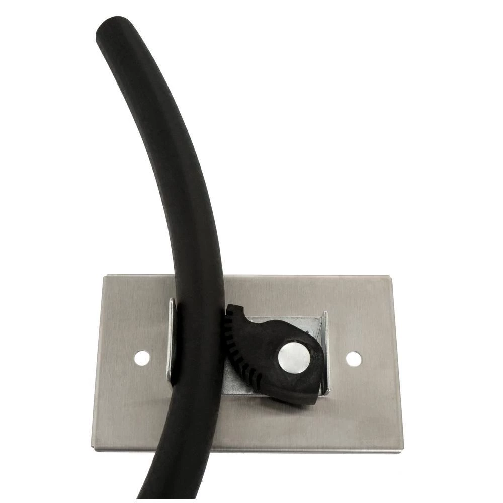 - Spring-loaded, molded rubber hose holder mounts on stainless steel wall plate