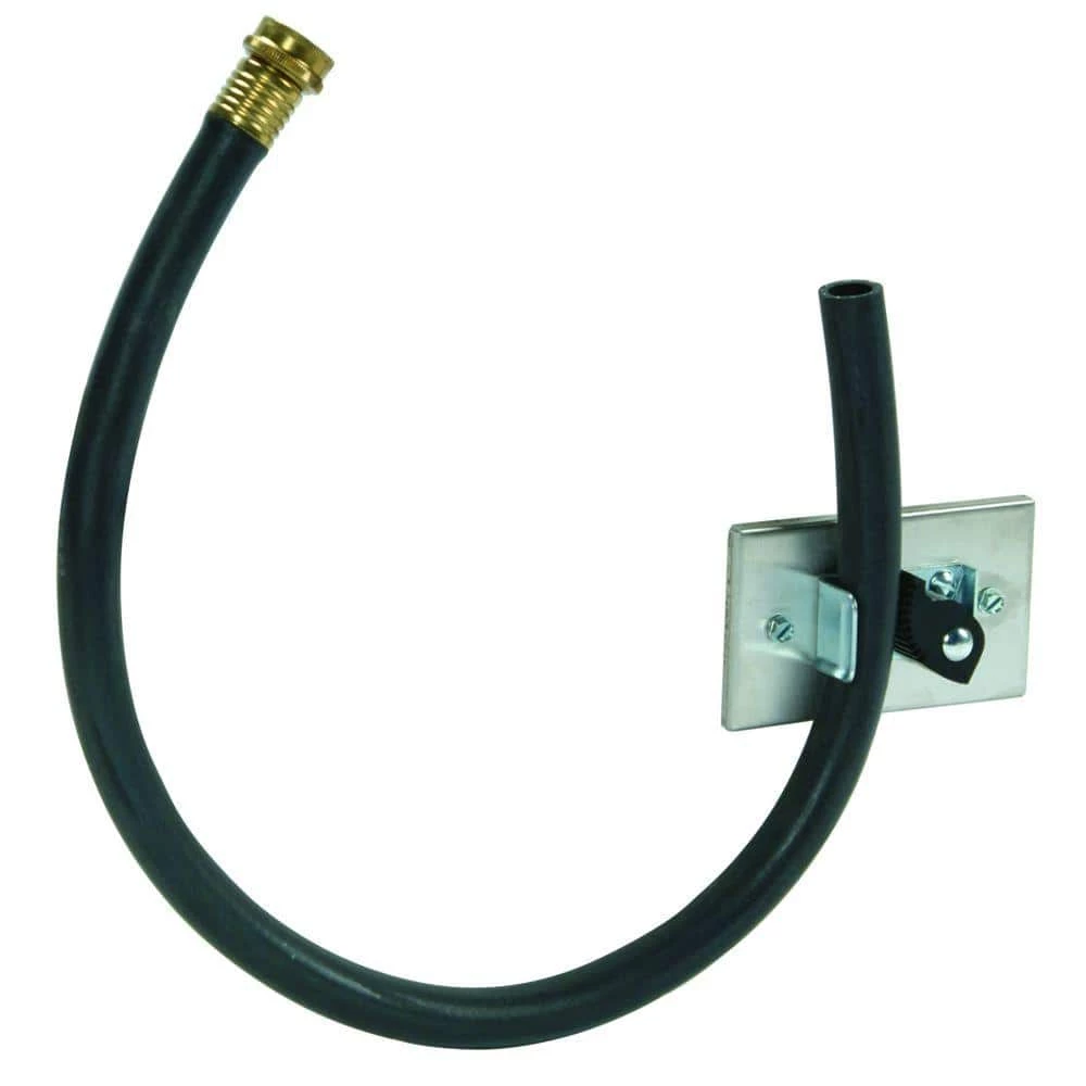 The MUSTEE, E. L. & Sons, Inc. Hose and Holder Accessory in Stainless Steel consists of a heavy-duty rubber hose with a brass coupling at 1 end and a molded rubber hose holder that is mounted on a stainless steel wall plate. The hose is designed to connect with the Model M63.600 Faucet (not included). Mounting hardware is included for easy installation.