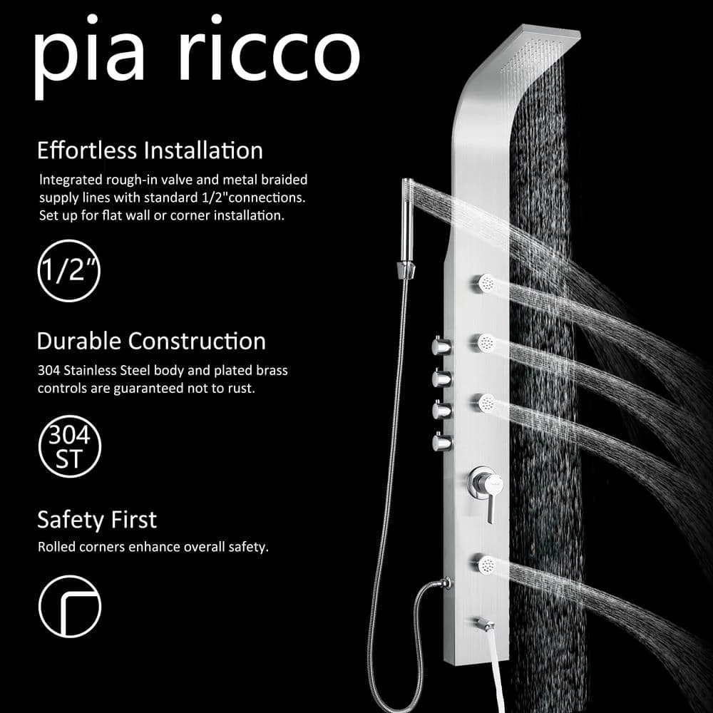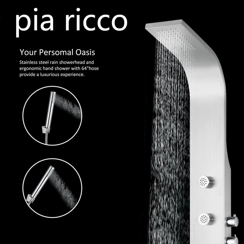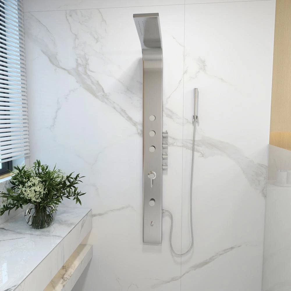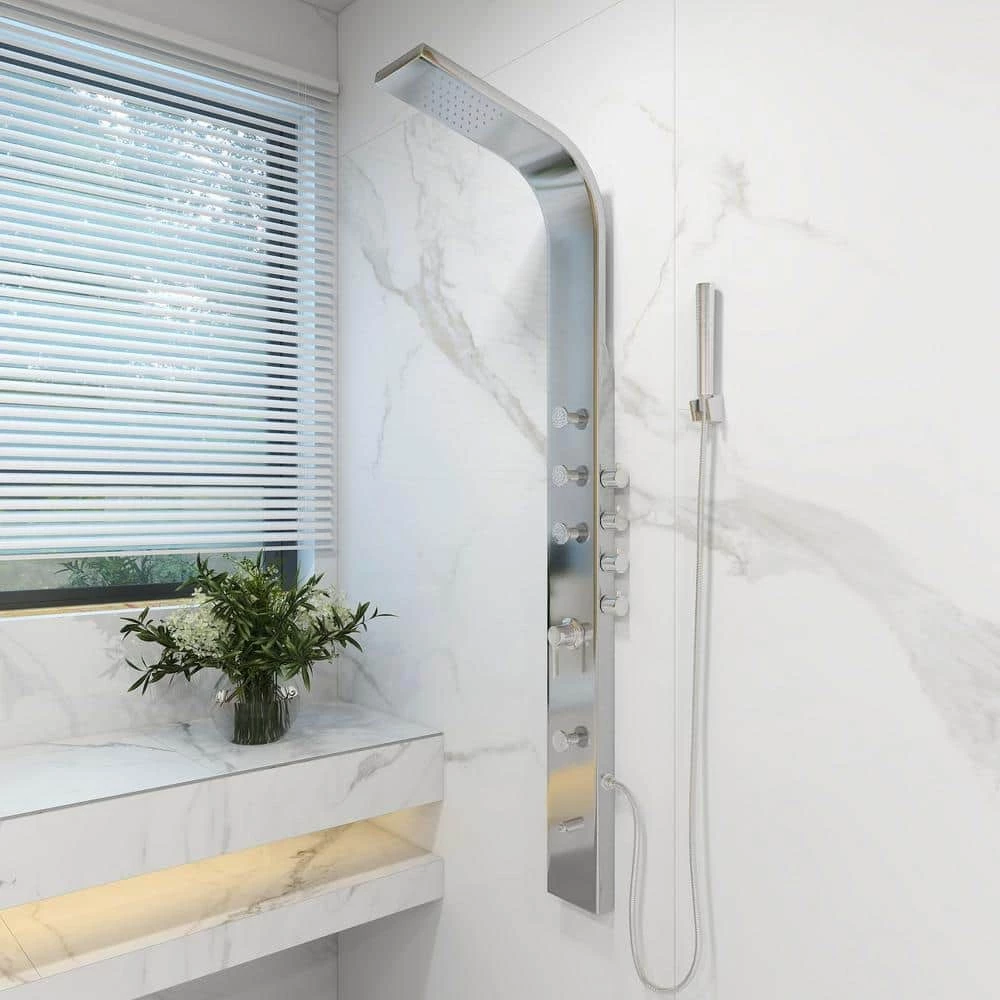 - Slimline luxury shower panel has built-in rainfall showerhead, high-powered body spray jets, and high-efficiency handheld shower wand