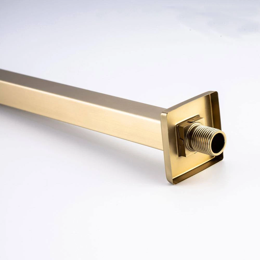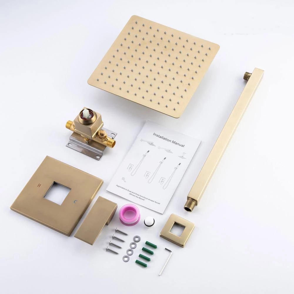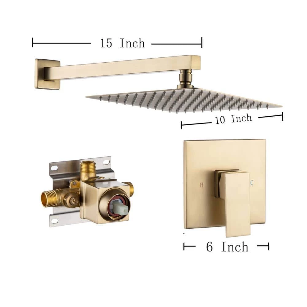 Pressure Balance cUPC Certified Water Pressure Balance Cartridge continuously monitors small pressure changes in both hot and cold water, it automatically compensates the heat and cold caused by the change of water pressure, so that the change of water temperature can be controlled within the range that the human body can hardly feel Complete Shower Set this rainfall shower set contains all the components to finish the installation. Pre-embedded brass mixer valve with trim kit, extra-long 15.7 in. brass shower arm with flange, 10 in. high pressure stainless steel top rainfall shower head (Touch clean nozzles) and mounting accessories Finish High quality Brass Brushed Gold surface treatment, warm and cozy appearance, scratch and corrosion resistant. Single handle to precisely control water flow and temperature Easy to Install Utility American standard 1/2 in. NPT connectors for hassle-free installation. Clear marks at concealed box, when you first look at it, you going to know how to connect the plumbing pipes.