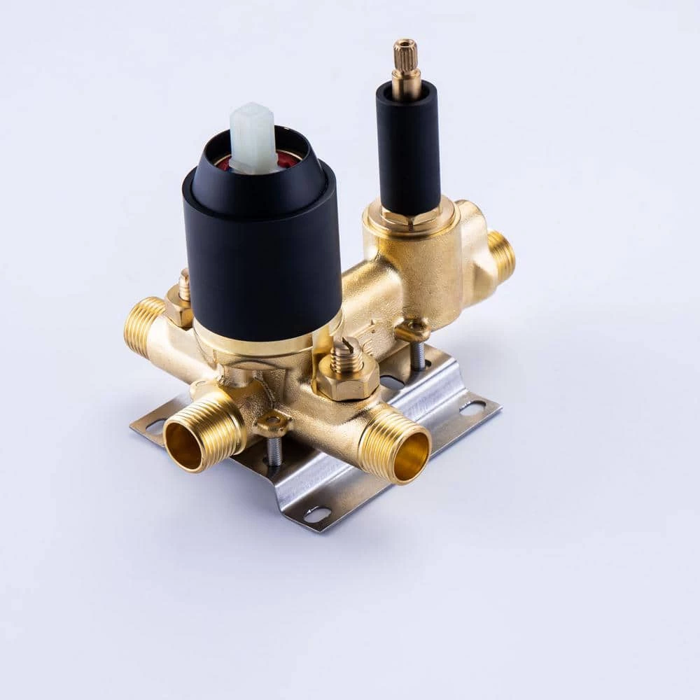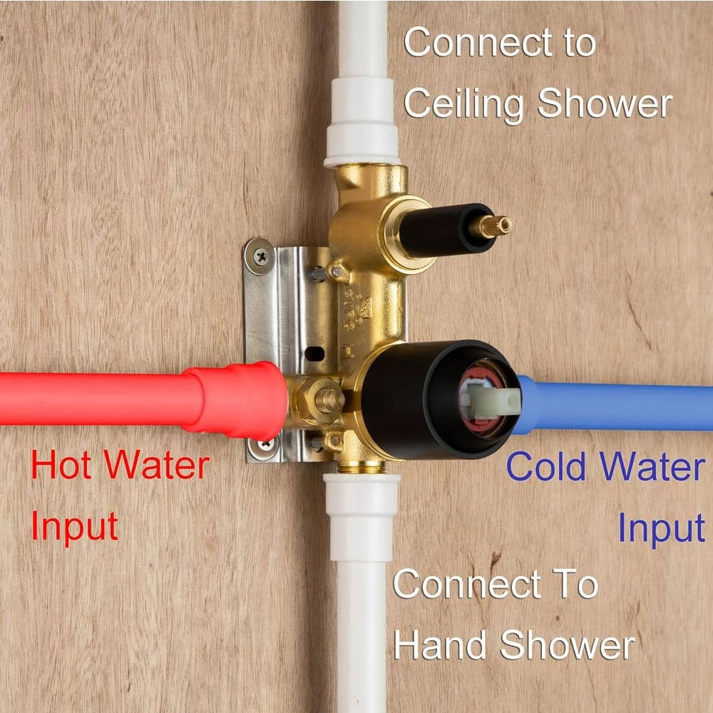 3-functions handheld shower head and single function rain shower head 10 in. rain shower head and handheld shower head offer consistent powerful shower even under low water pressure. Pressure balancing valve cartridge the valve body contains an adjustable water pressure device, this brass valve directs water flow to 2-showering functions, pressure-balancing valve maintains water pressure and controls temperature. The elegant, chrome finish and sleek look shower system complements any decor designed to easily install with standard U.S. plumbing connections. This shower set package includes valve trim include rough in valve, rain shower head, handheld shower head, shower arm and elbow shower holder.