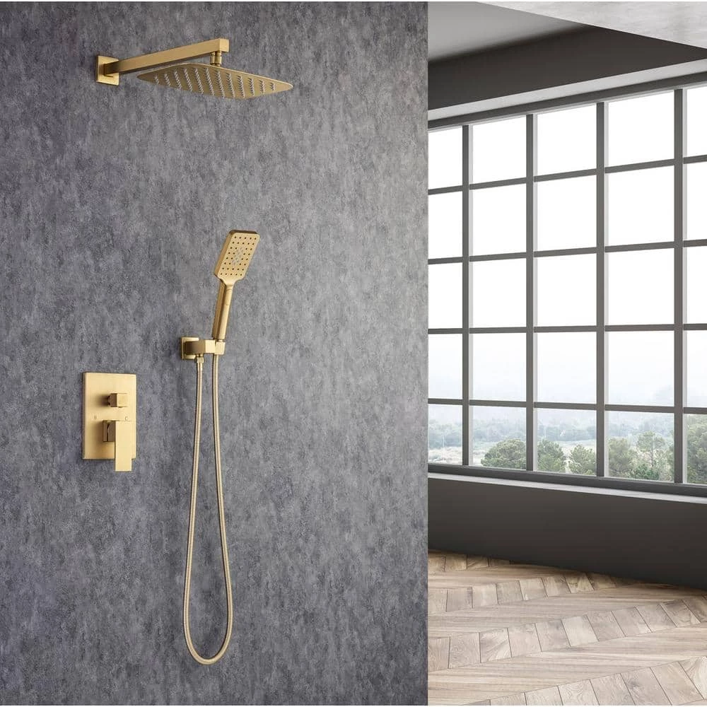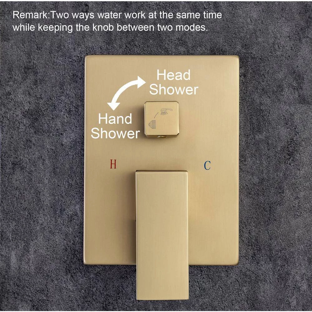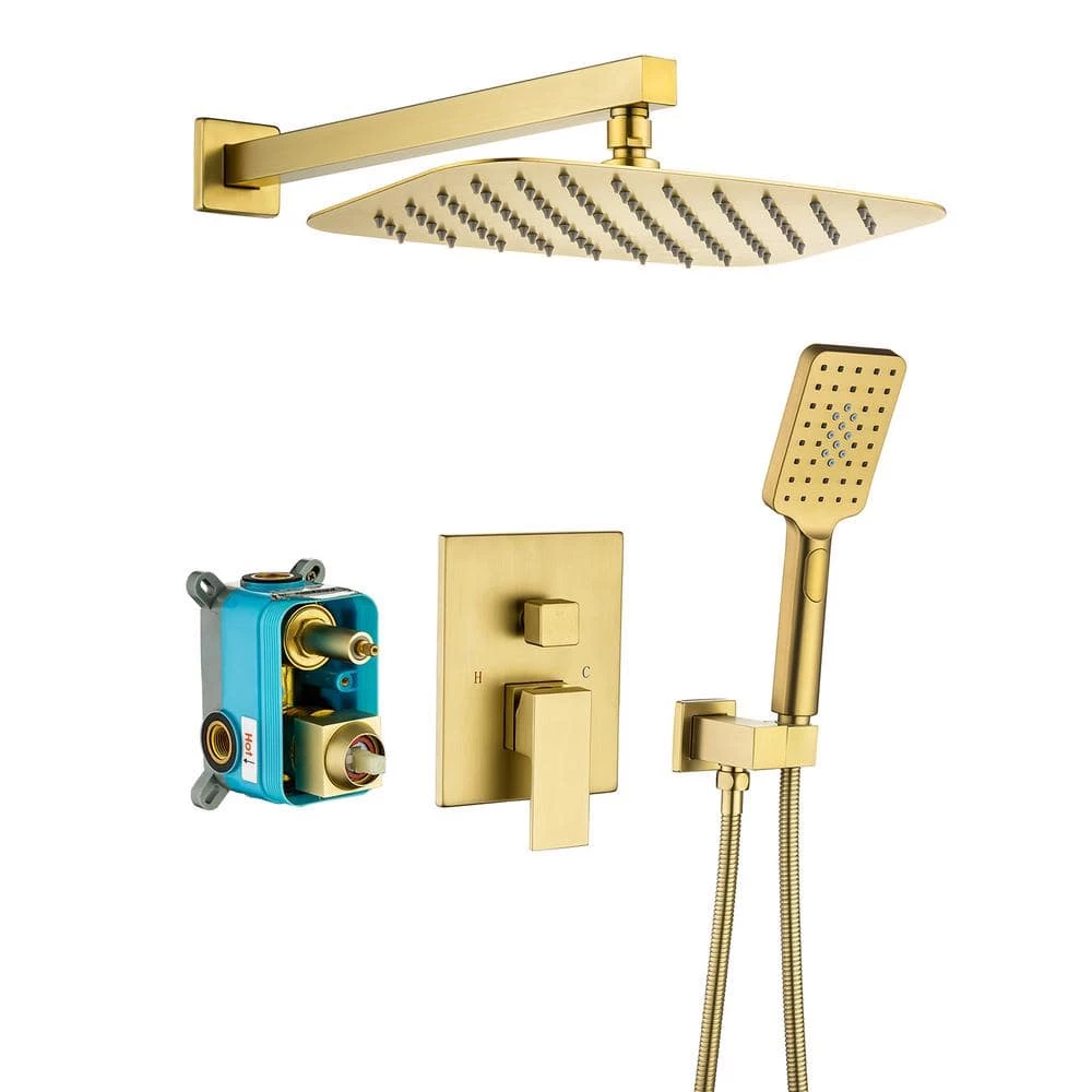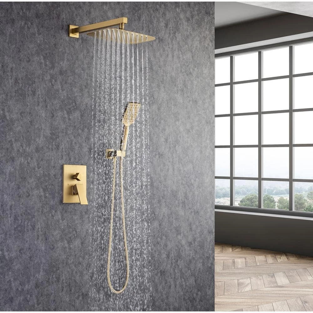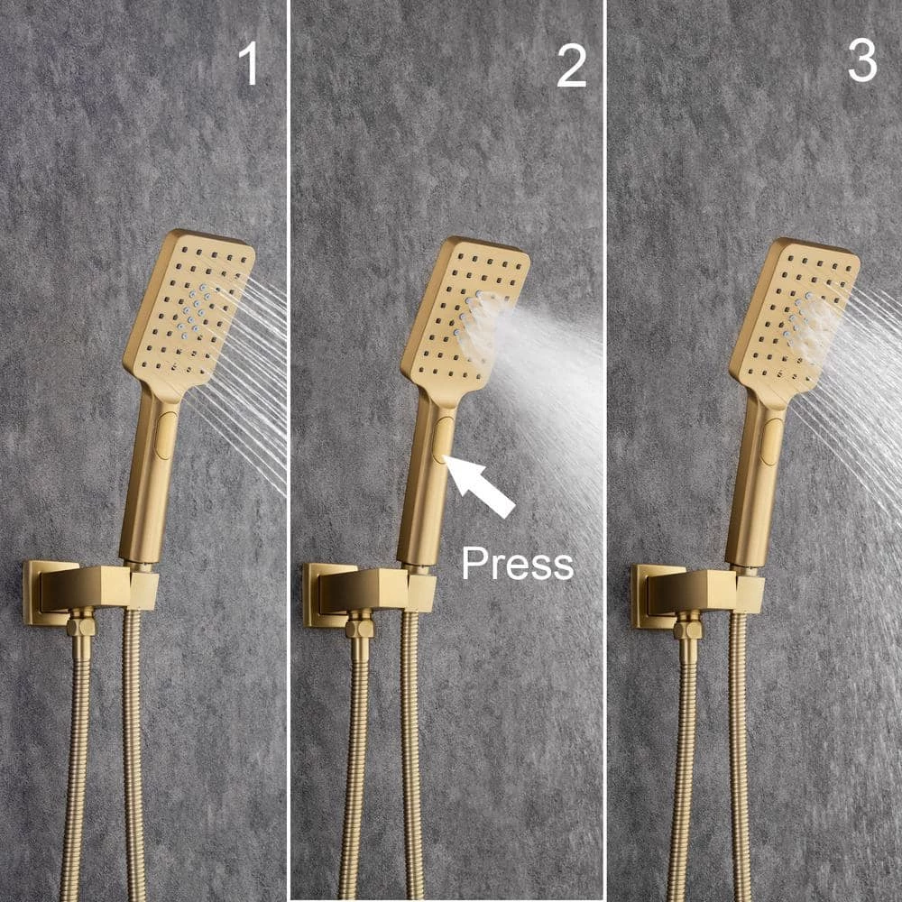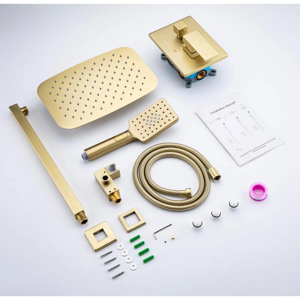 12 in. brand new rectangle design shower head design. rainfall shower head, handheld shower wand, all-in-one diverter, switch different model by turning one know. 3-spray handheld shower, switch by push button, 15 in. wall-mount shower arm, anti-scald valve, 60 in. shower hose and shower bracket holder. All parts of this wall-mount mount shower system are made of high-quality metals with professional technology. The matte black finish and brass combination offers anti- corrosion and modern looking. Air-in technology offers high water pressure even at low water pressure supply. Anti-scald valve protects from rapid changes in hot or cold-water pressure. Installation tips. The standard US NPT 1/2 in. connector is compatible with most existing shower system pipes.