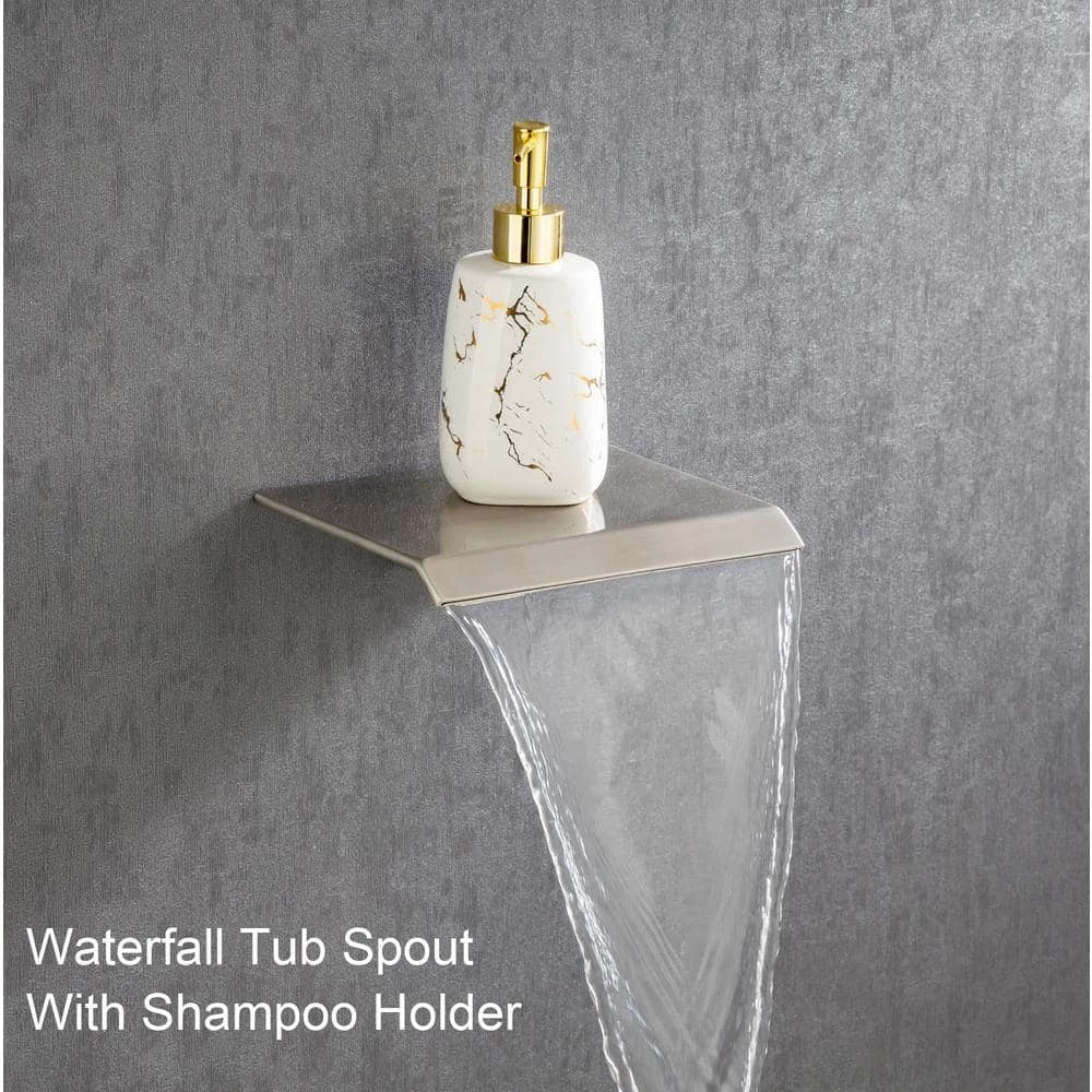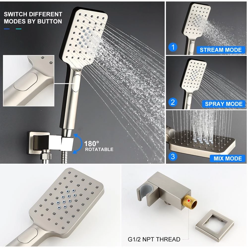 Unique waterfall bathtub spout – elegant wide waterfall output. New release 12 in. rectangle shower head: the unique design rectangle shower head is very elegant and fashionable design. All-in-1 diverter, easy to switch different model by 1-knob. 3-spray model handheld shower: switch different 3-spray model by button: cUPC certificated pressure balance: shower system prevent sudden hot water that burns our skin and can even damage the epiderma. Air technology: having a beautifully designed showerhead is not enough for you to have the most comfortable bathroom. Brushed golden color.