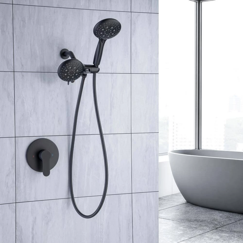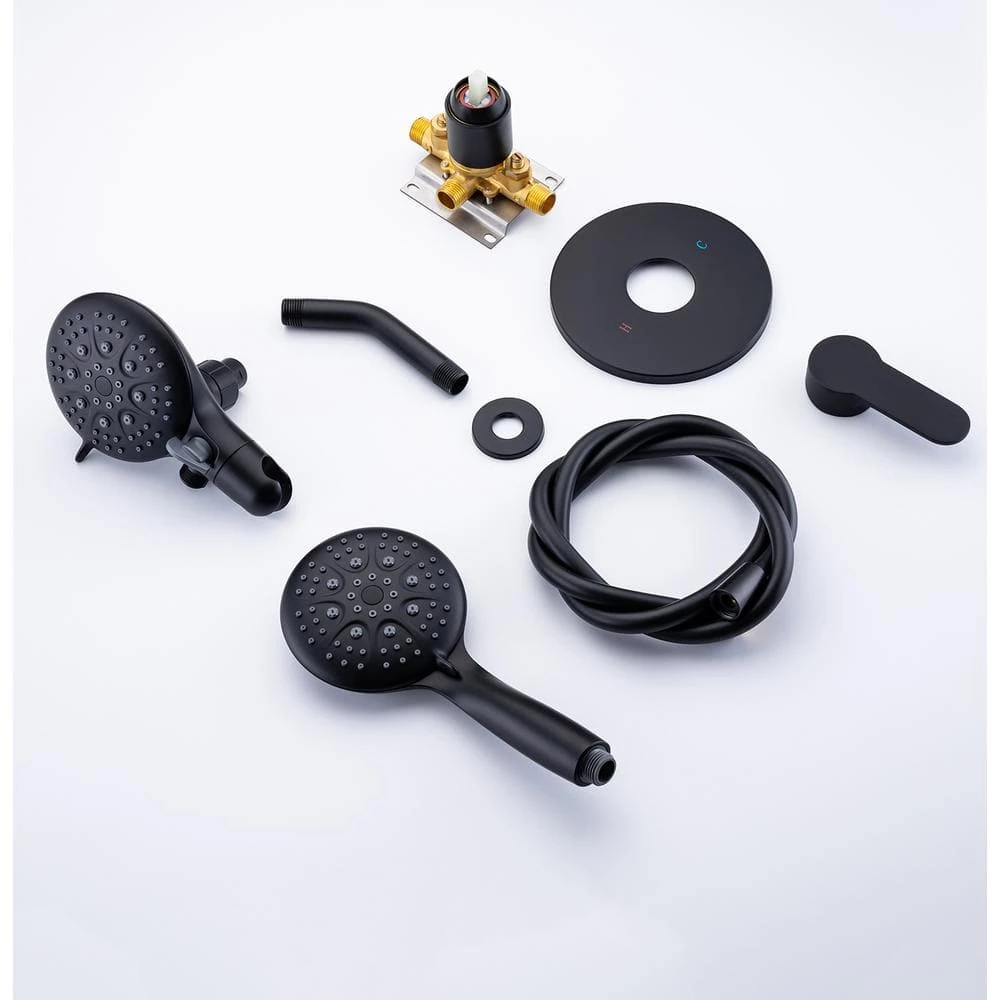 Use luxurious 6-setting overhead shower head and 6-setting hand shower separately or both together! Choose from 35 full and combined water flow patterns. Each shower features Oversize 4.375 in. Matte Black Face with Click Lever Dial and Rub-clean Jets. 6 settings include: Power Rain, Massage, Stay-Warm Mist, Water-saving Economy Rain and Pause. Patented 3-way Water Diverter with Anti-Swivel Lock Nut and Angle-Adjustable Overhead Bracket. 59 in. Super Flexible Stainless-Steel Hose with Conical Brass Hose Nuts for easy and reliable hand tightening. Plumber’s Tape and all Washers included. Ten-layer Matte Black plated finish offers a sleek look, ensuring corrosion resistance and durable; High pressure technology offer consistent powerful rain shower even under low water pressure, Lifetime warranty, offer replacement within 5 years. Includes valve and trims, need to be installed in the wall and suitable for reconstruction and renovation. Pressure balance valve’s cartridge monitor water pressure balance, helping to protect you from being scalded by sudden changes in hot or cold-water pressure.