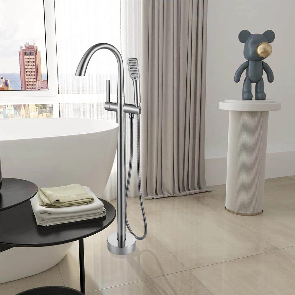 Contemporary styling from the Topcraft Collection freestanding single handle floor mounted tub filler creates a modern and elegant streamlined look. Available in brushed nickel, chrome, matte black and oil rubbed bronze, this faucet complements a variety of bathroom settings. The faucet’s smooth, single-handle operation allows for easy temperature control.