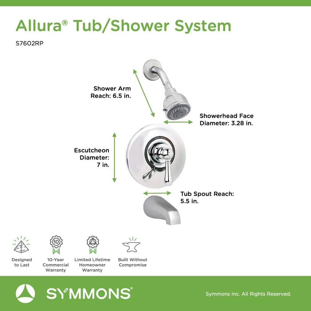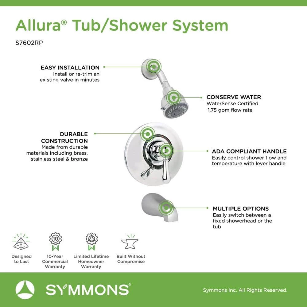The solid construction and style of the Symmons Allura Collection give it a distinctive presence in any traditional bathroom. This Allura tub and shower trim kit is made from durable materials and plated in an abrasion resistant finish over solid metal. It consists of a shower arm, low flow showerhead, escutcheon, adjustable lever handle, valve with VersaFlex Integral Diverter, and non diverter tub spout. Turn the ADA compliant lever handle on the valve cover plate in the direction of the hot and cold indicators to adjust to the shower water temperature. The secondary lever handle functions as a diverter, letting you to adjust the flow of water from the showerhead to the tub or vice versa. At a low flow rate of 1.75 gallons per minute, the eco friendly WaterSense Certified showerhead helps you conserve water, while saving on your water bill. Its rubber nozzles make the showerhead simple to clean, too. This showerhead trim kit is easy to install and includes a limited lifetime warranty and the backing of the Symmons technical support team.