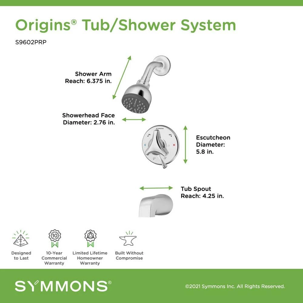 A transformation of three core product lines, the Symmons Origins Collection combines high quality with a stylish look. This trim kit includes a shower arm, low flow showerhead, escutcheon, adjustable handles, valve with VersaFlex Integral Diverter, and non diverter tub spout. Turn the tri star handle on the valve cover plate in the direction of the hot and cold indicators to adjust to your desired water temperature. The secondary lever handle works as a diverter, allowing you to switch the flow of water from the showerhead to the tub or vice versa. At an eco friendly low flow rate of 1.75 gallons per minute, the showerhead helps you conserve water and save on your water bill. Its rubber nozzles make the showerhead simple to clean, too. This hand shower and showerhead trim kit is simple to install and comes with a limited lifetime warranty and the backing of the Symmons technical support team.