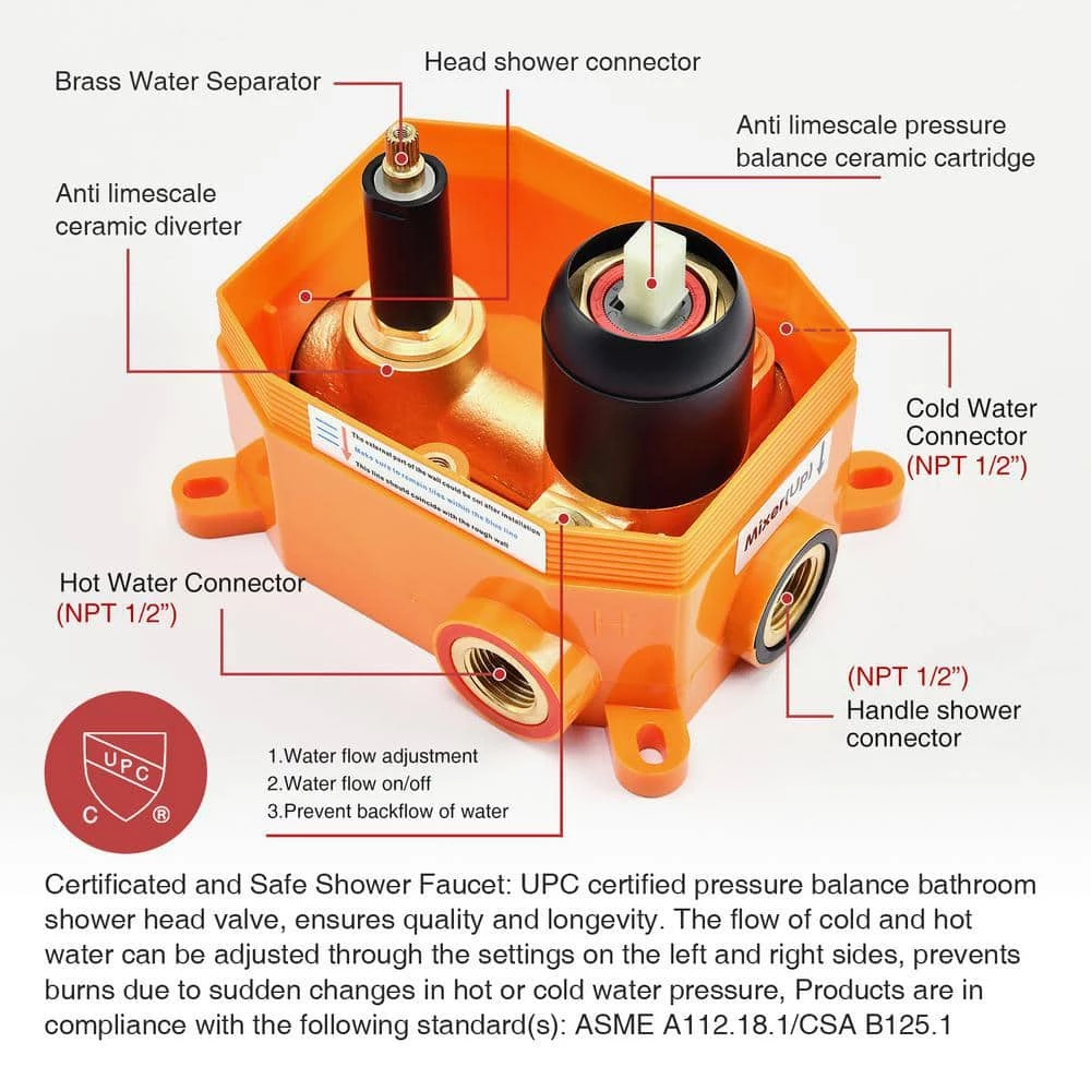 - QUALIFIED: Certificated and Safe Shower Faucet: UPC certified pressure balance bathroom shower head valve, ensures quality and longevity. Products are in compliance with the following standard(s): ASME A112.18.1/CSA B125.1