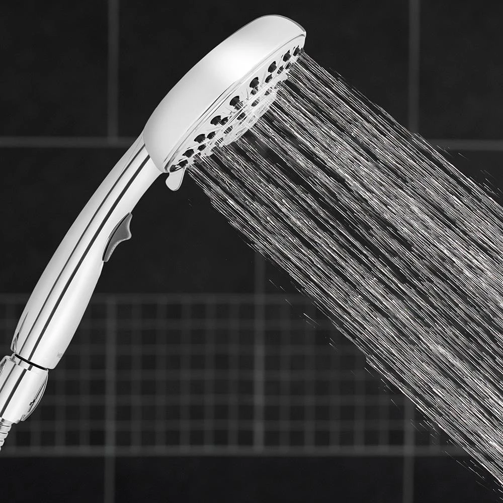 The Easy Reach 6-Spray Hand Shower with 8 ft. Hose in Chrome combines the powerful showers you love with the convenience your whole family needs. This hand held shower head offers six (6) spray settings including the relaxing Full Body spray, invigorating Power Spray and soothing Pulsating Massage to awaken the senses and penetrate muscle aches and pains. Plus, the extended reach of an 8 ft. hose makes it easy to bathe children or pets, or help those with special showering needs. This hand held shower head also features a pause-in-handle switch that lets you to reduce water flow to a water-saving trickle while soaping, shaving, or helping others.