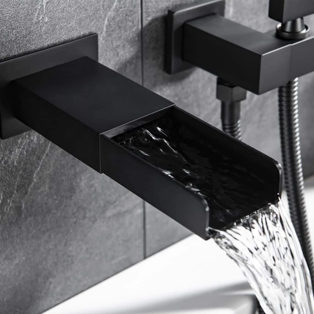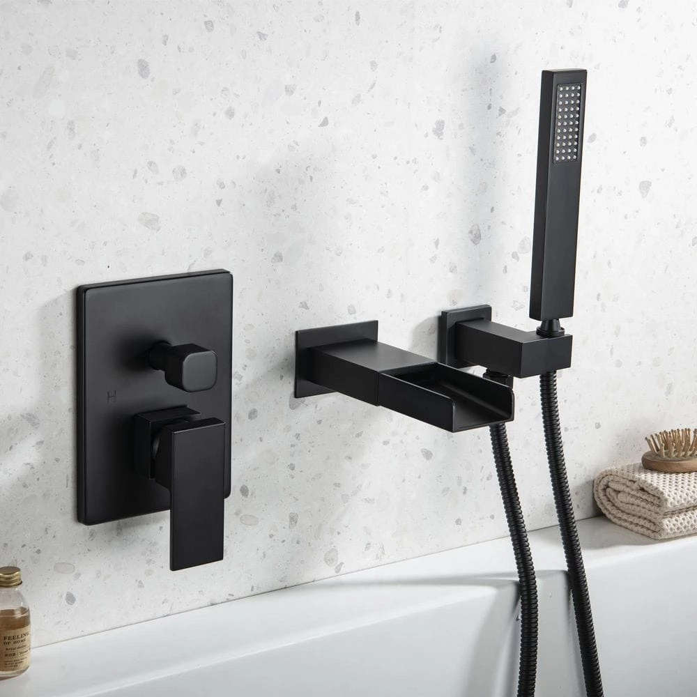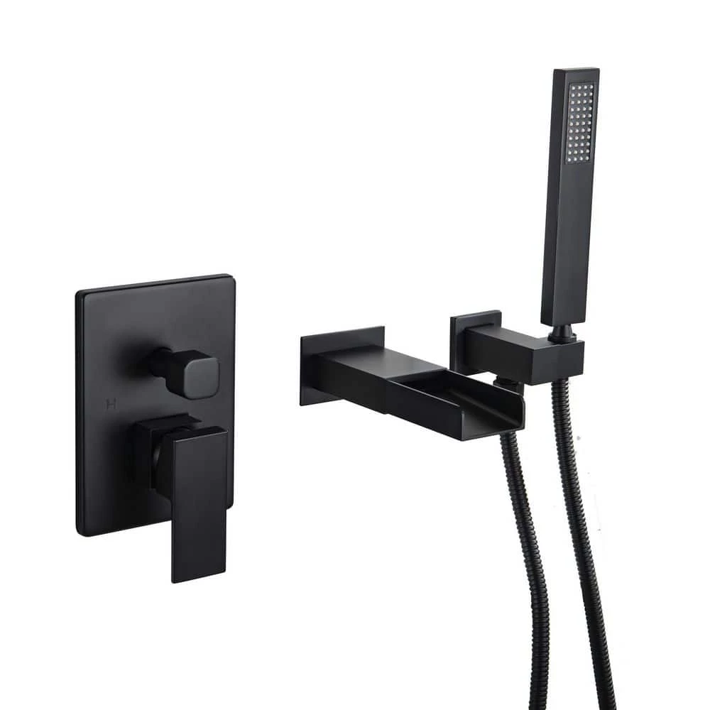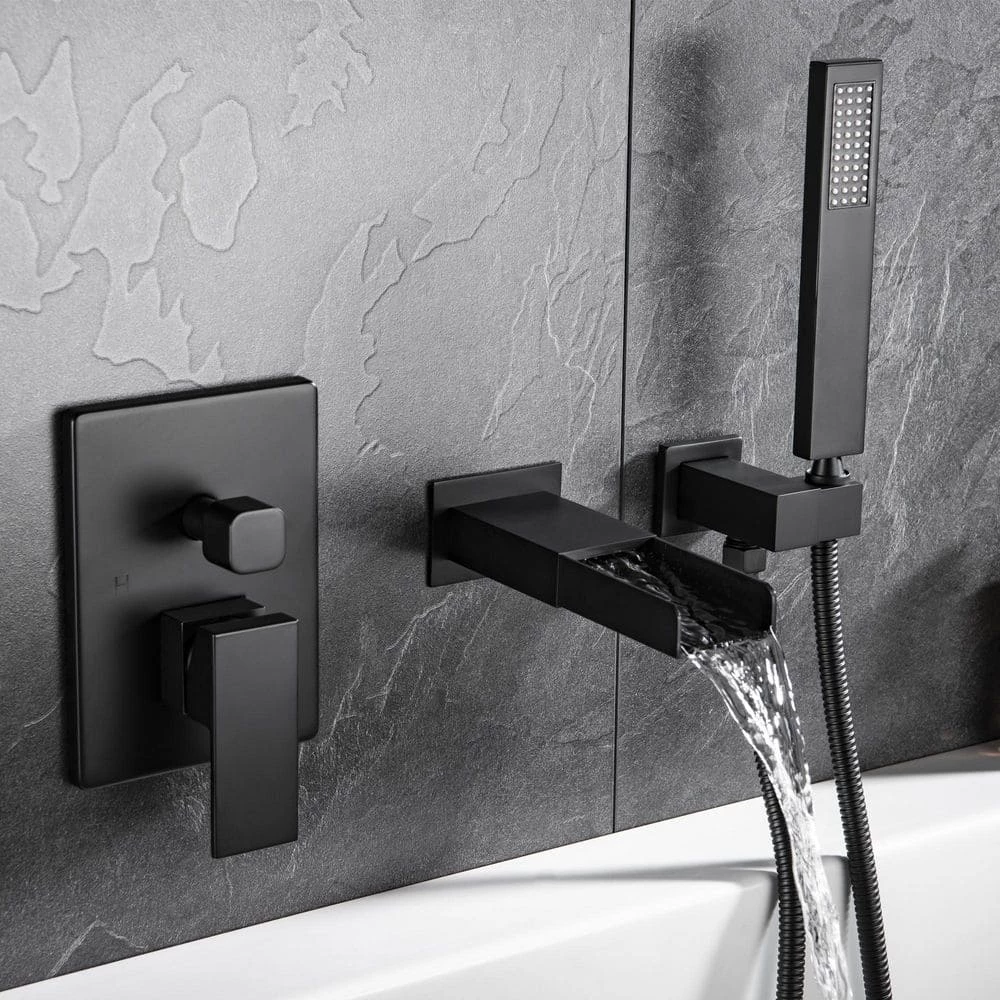 Constructed from solid brass for the faucet body and stainless steel for the hose, this bathtub faucet can ensure durability and reliability. Featuring a flat waterfall spout, it sends a sheet of water down in the bathtub, creating a handsome waterfall effect. Pull and turn the square diverter knob, and water can be diverted from the spout to the hand shower. And the hand shower offers extra motion to aim at the specific area of your body. Destined to become the statement piece in your bathroom, this wall mount tub filler faucet has an appealing modern design to match all decorations.