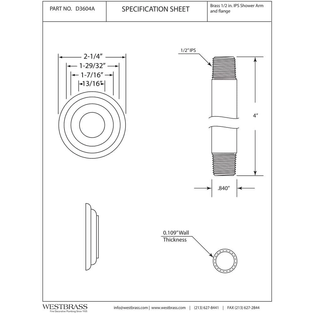 Use this plated, solid brass, 1/2 in. IPS, ceiling mounted shower arm, for small projection, ceiling mounted rain shower heads of all diameters. 4 in. long. Decorative, machined brass flange included: 1/2 in. x 4 in. ceiling arm and D3800 flange. Heavy Duty Flange. Lead Free Brass Nipple.