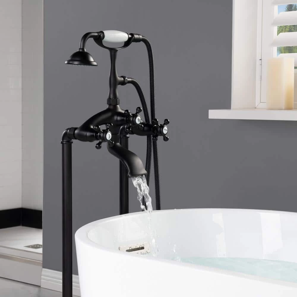- Package content: package includes bathtub faucet (crafted from high quality brass), brass tube, hand shower with 59 in. hose, 35 in. hot and cold water inlet hoses, metal tripod with mounting hardware, base cover and installation instruction