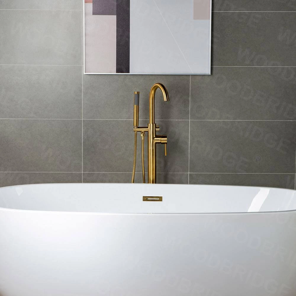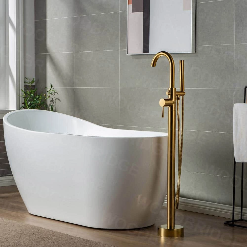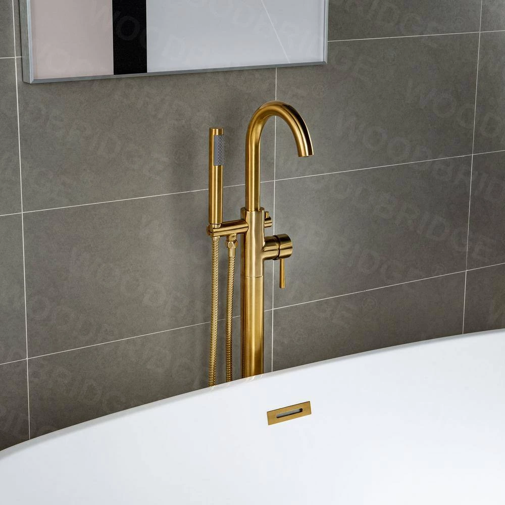 Contemporary freestanding tub filler faucet with hand shower is made from solid brass which is one of the most durable and reliable material that frequently used in plumbing industry better for hard water use and less likely to corrode or rust after years. Drip free ceramic disc cartridge with built in sediment filter; durable seals and ceramic shell prevent leaks and promote smooth operation and functionality for over 500,000 uses. It is more reliable and durable than any lower cost washer less or ball valve cartridge that widely used in plumbing industry. Single lever handle allows flow rate and temperature control in one hand. High quality NEOPERL aerator control the straightness and diameter of the water stream while reducing noise, splashing and side spray by aerating the water as it exists the faucet. Also they save water, reduce energy costs and filter sediments while meeting local plumbing code. Easy removal to clean any debris or mineral on screen after daily use and reuse it. The dual functionality of our detachable sprayer is the perfect tool for all your bathing needs including rinsing your hair, washing children or pets and also for keeping the tub clean after use. When finished, simply slip the sprayer back to its secure dock. Our high quality brass tripod base, which comes standard with expansion bolts for install on concrete, allows for easy and stable installation while seamlessly allowing for water supply to pass through.