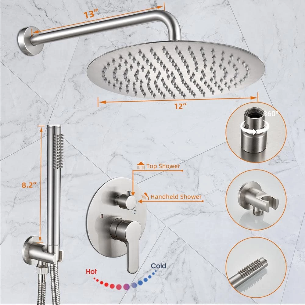 - Supported by 13 in. shower arm, you can have a larger space to shower staying away from the wall
