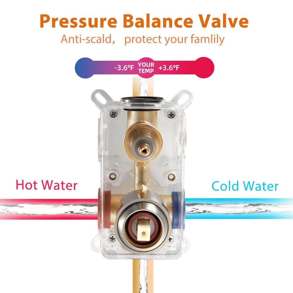 - Pressure balance valve chamber monitors water pressure balance to avoid scald, our mixing valve has an adjustable hot and cold-water flow device and a check valve, which helps us to adjust the proper flow of hot and cold water when necessary